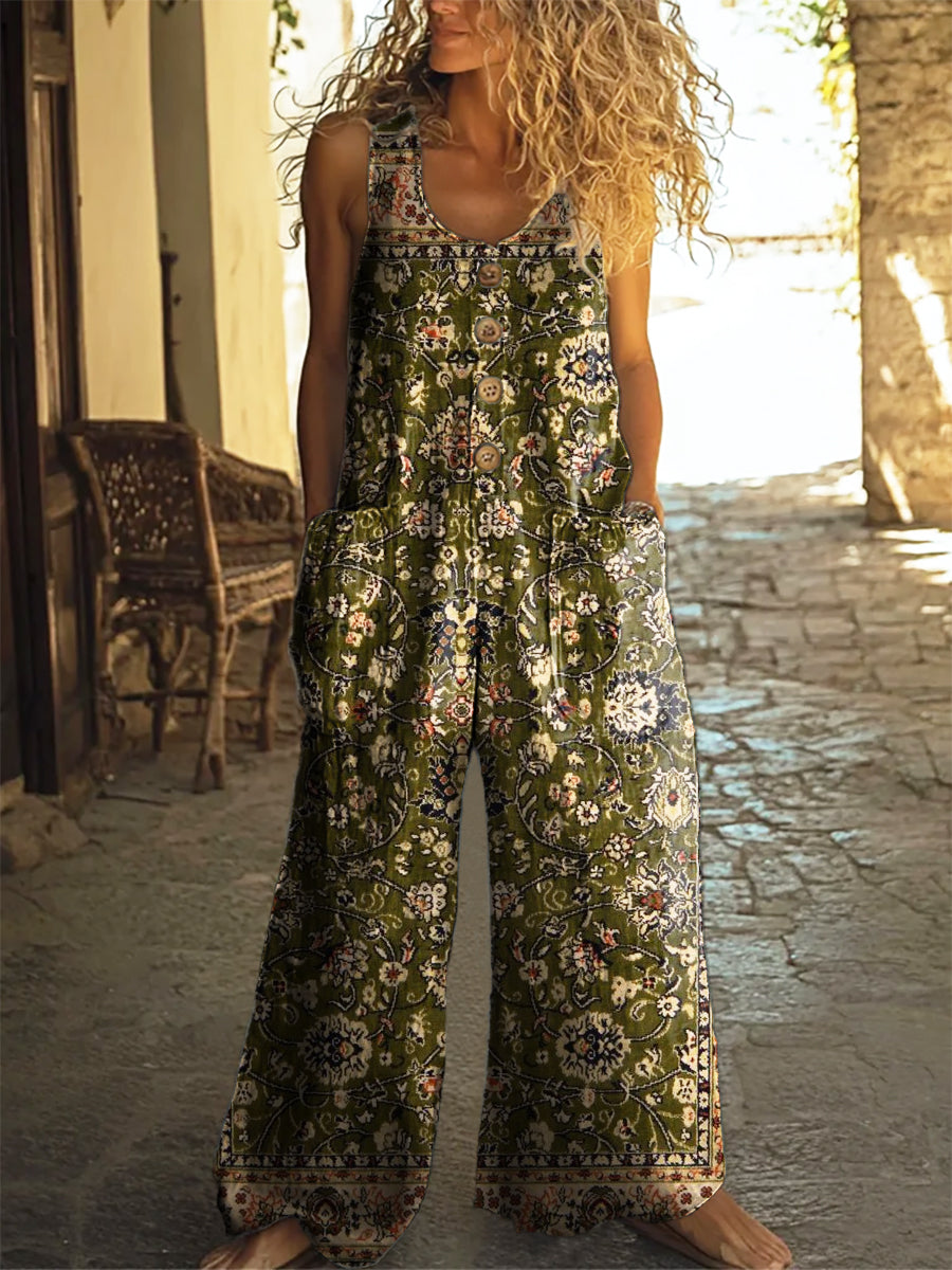 Women's Vintage Ethnic Totem Floral Art Print Casual 100% Cotton Wide Leg Jumpsuit