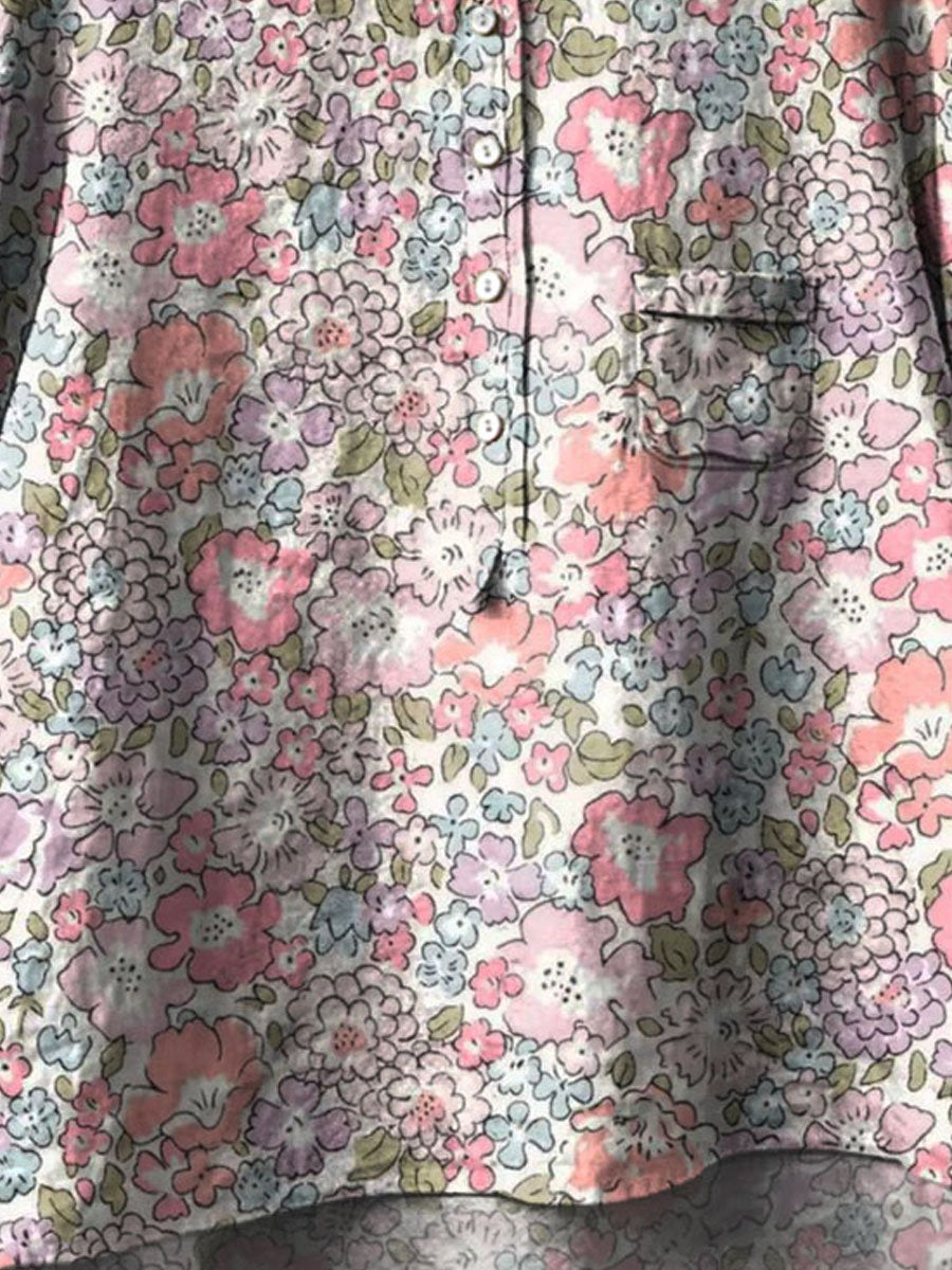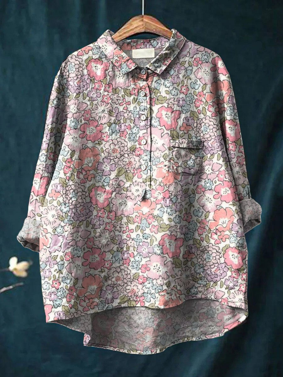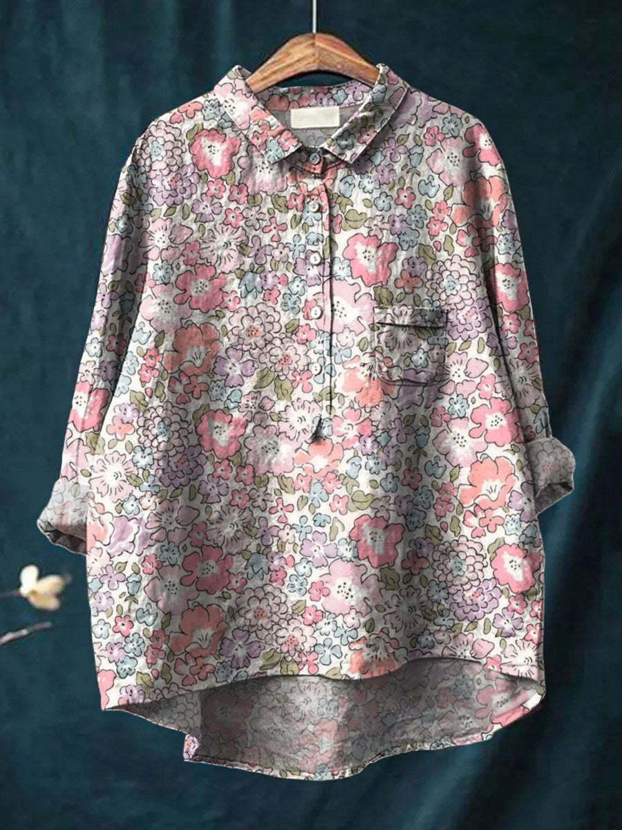Women's Vintage Floral Art Print Casual Cotton And Linen Shirt