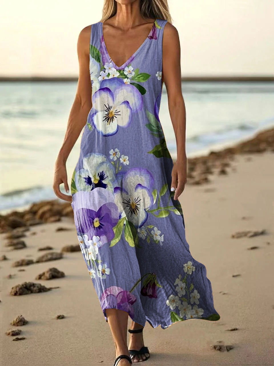 Women's Vintage Floral Art Print Sleeveless V Neck Pocket Cotton Dress