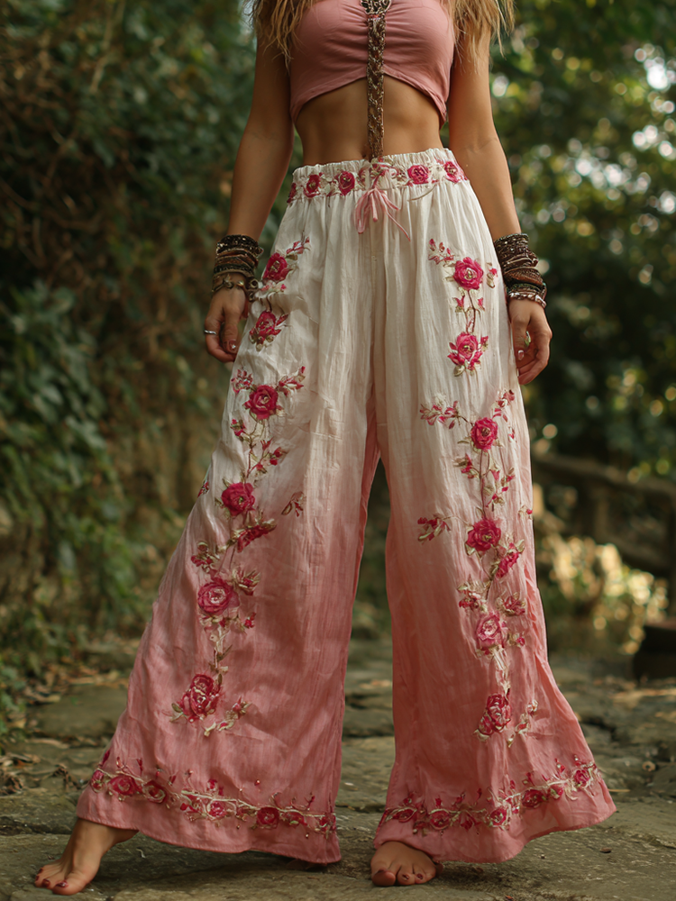 Women's Vintage Floral Embroidered Linen Casual Wide Leg Pants