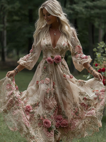 Women's Vintage Rose Floral Embroidery Art Casual V Neck Maxi Dress