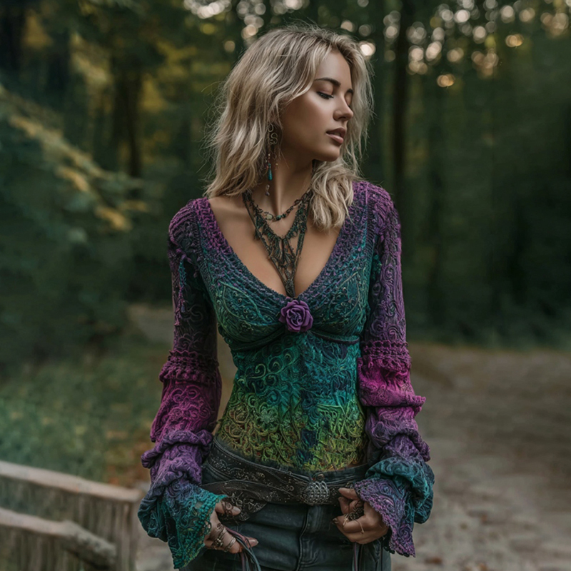 Women's Vintage Rose Floral Gradient Art Knit V Neck Sweater