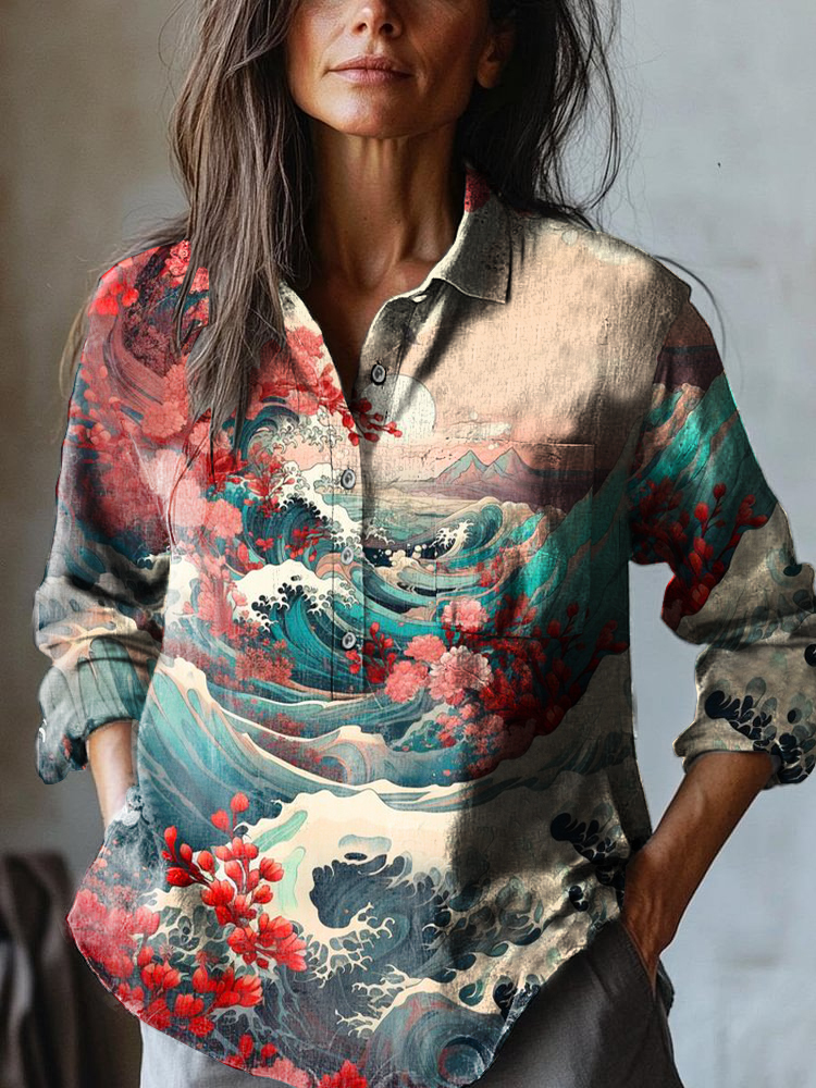 Women's Vintage Sea Waves Art Print Casual Cotton And Linen Shirt