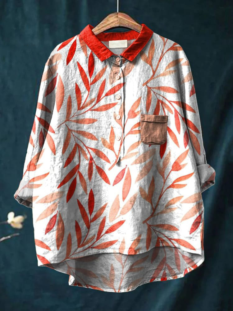 Decorative Pattern of Slender Leaves In Red Tones Casual Cotton And Linen Shirt
