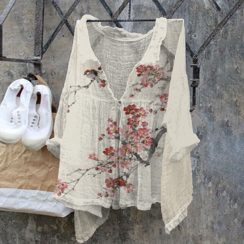 Flowers And Birds Art Ink Painting Linen Blend Cozy Shirt