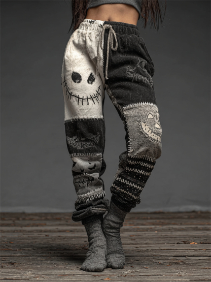 Halloween Spooky Faces Contrast Patchwork Washed Sweatpants