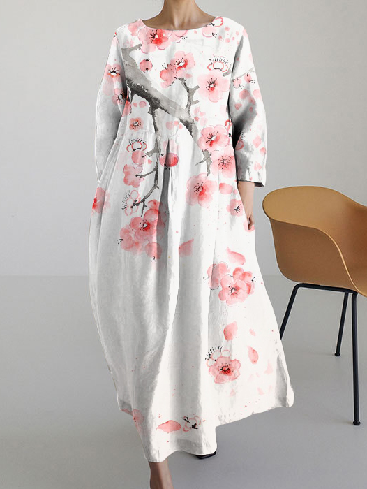 Japanese Cherry Blossom Round Neck Long Sleeve Midi Dress