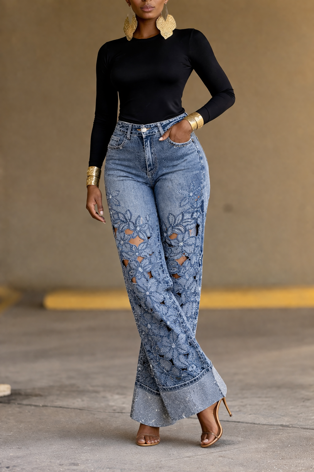 Design: Features a high-waisted straight-leg cut, intricate floral cutout details along the legs, and sparkling rhinestone embellishments throughout, finished with a rolled cuff for a chic, feminine touch.