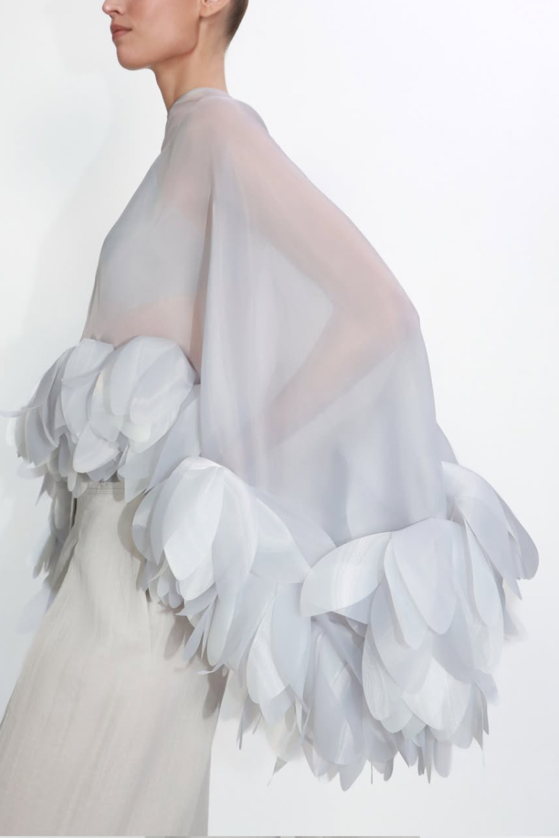 Light Grey Sheer Organza Blouse with 3D Petal Ruffle Sleeves