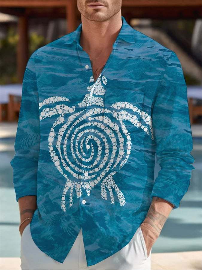 Maui Turtle Print Lapel Pocket Long Sleeve Men's Shirt
