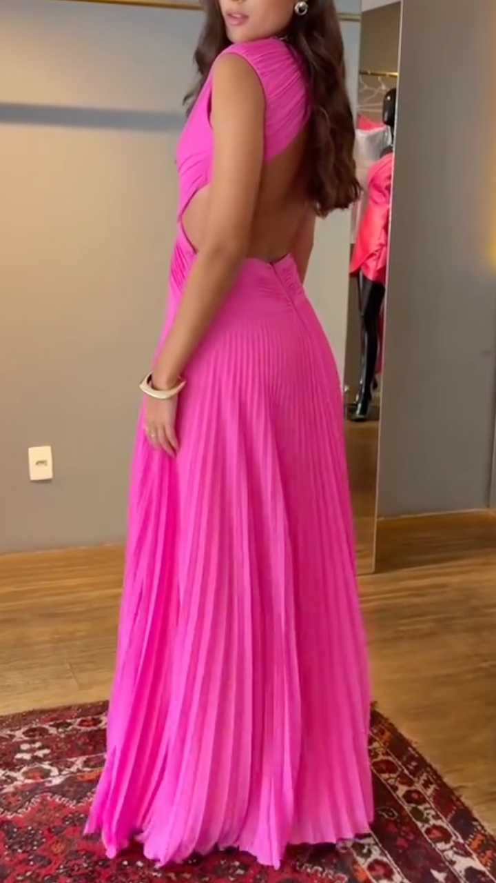 Neon Pink Cut-Out Pleated Maxi Dress