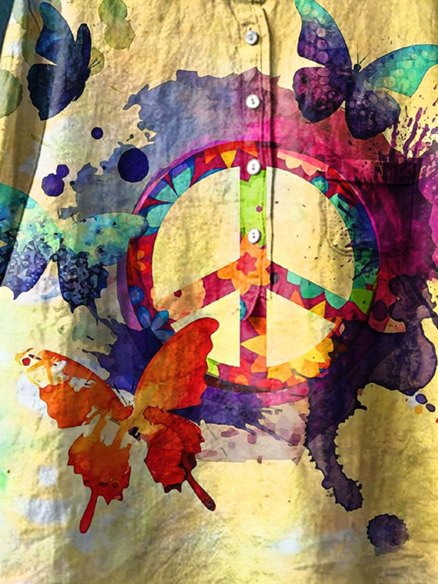 Peace And Love Butterfly Art Pattern Print Casual Cotton And Linen Shirt