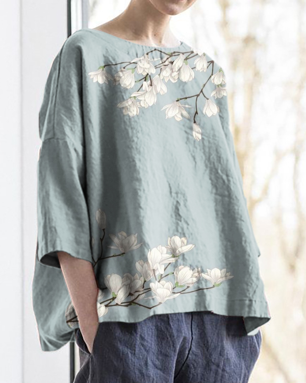 Vintage Floral Art Print Round Neck Cotton and Linen Loose Top