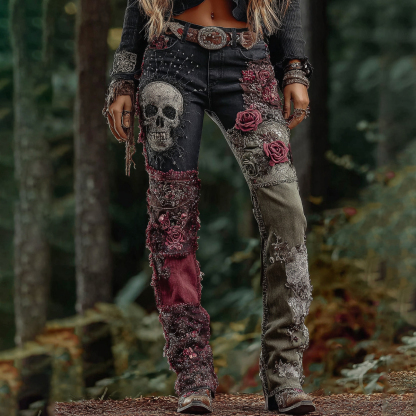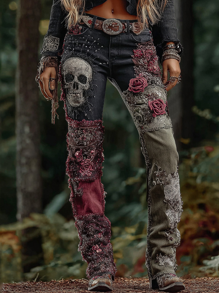 Rose And Skull Embroidered Patchwork Gothic Rock Jeans