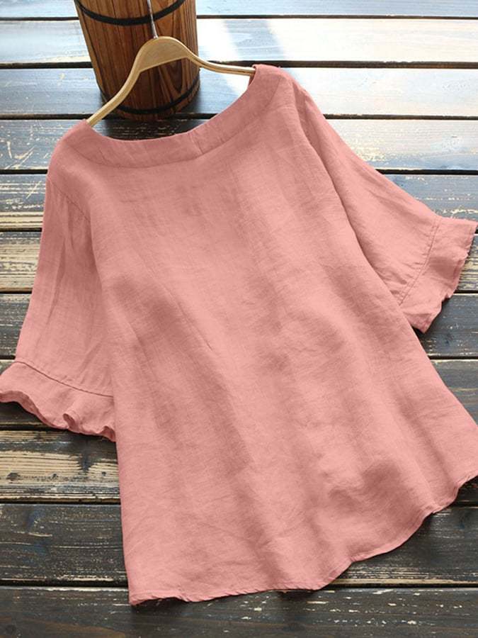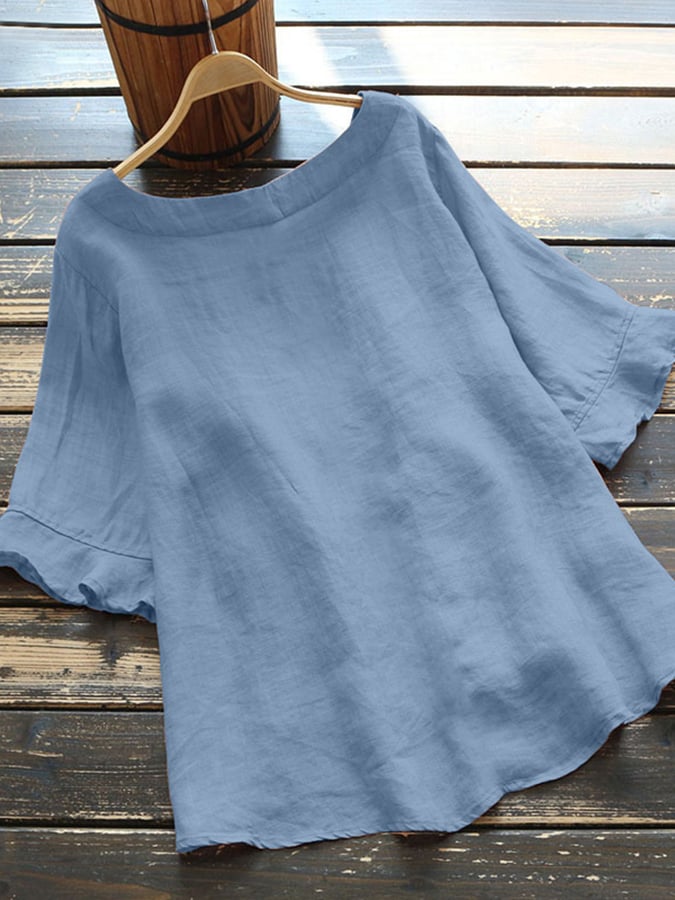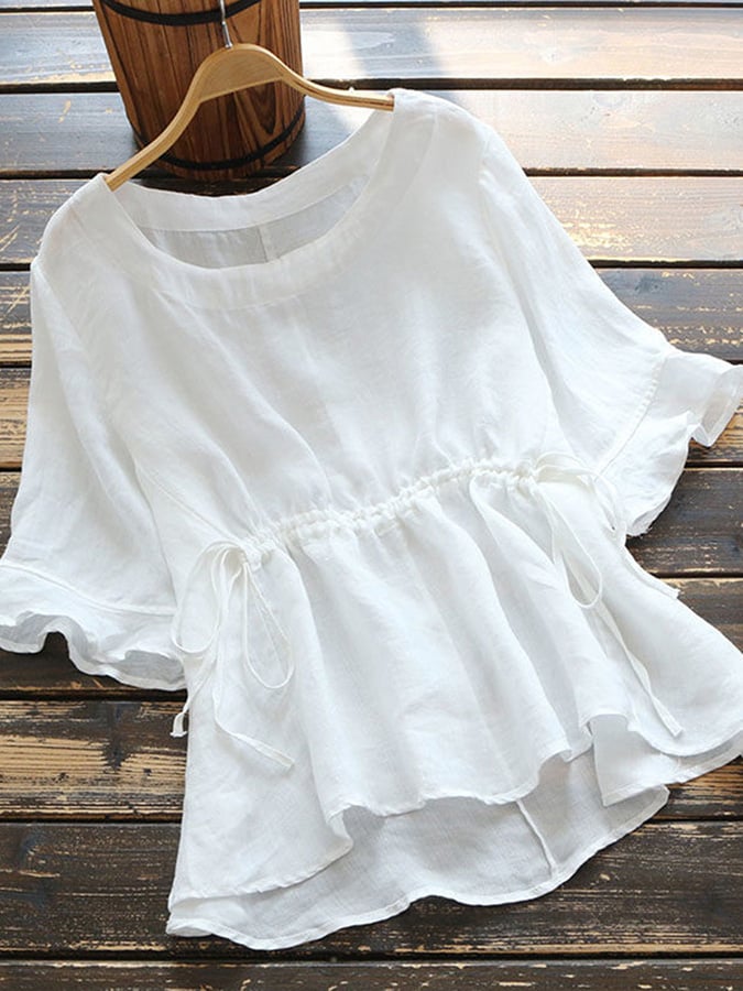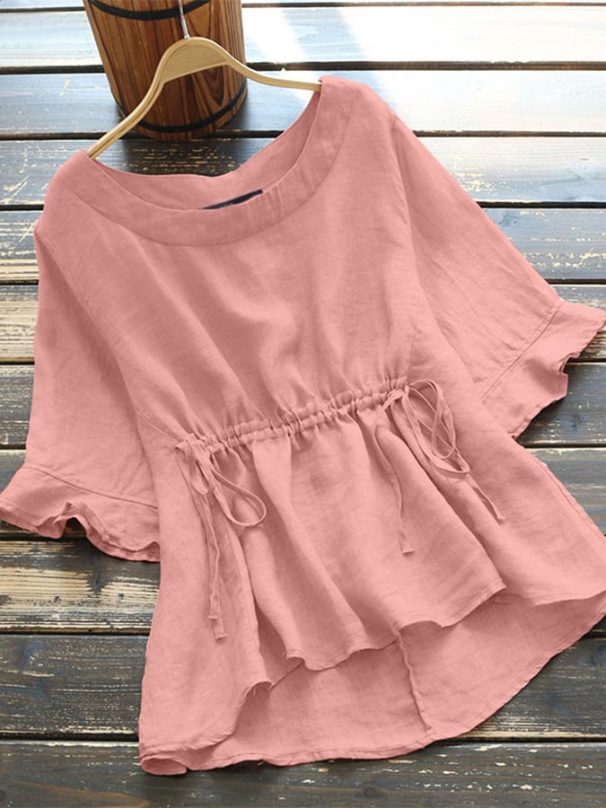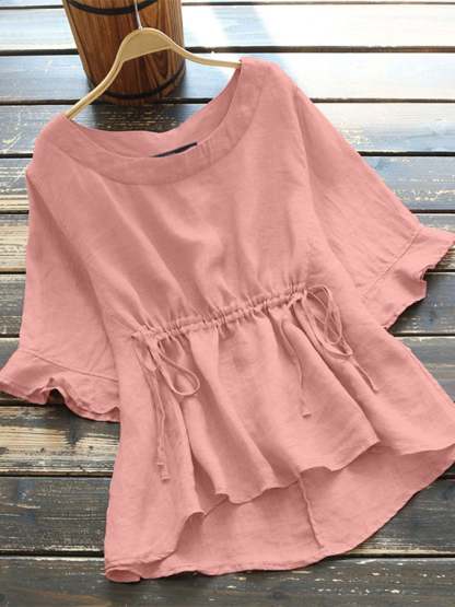 Solid Cotton And Linen Round Neck Waist Casual Top