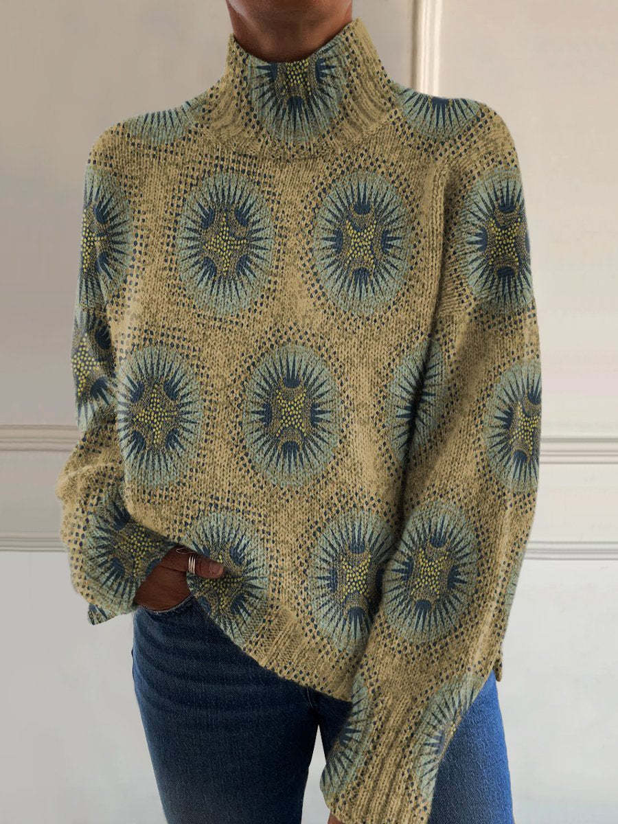 Stylish Retro Circular Flowers Art Print Knit Turtleneck Pullover Sweater