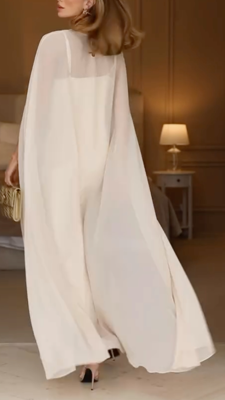 Material: The inner slip dress is crafted from premium smooth satin fabric, featuring a luxurious sheen, soft hand feel, and excellent drape. The outer cape is made of lightweight, flowy sheer chiffon, creating an ethereal, elegant silhouette while ensuring breathability and comfort.
