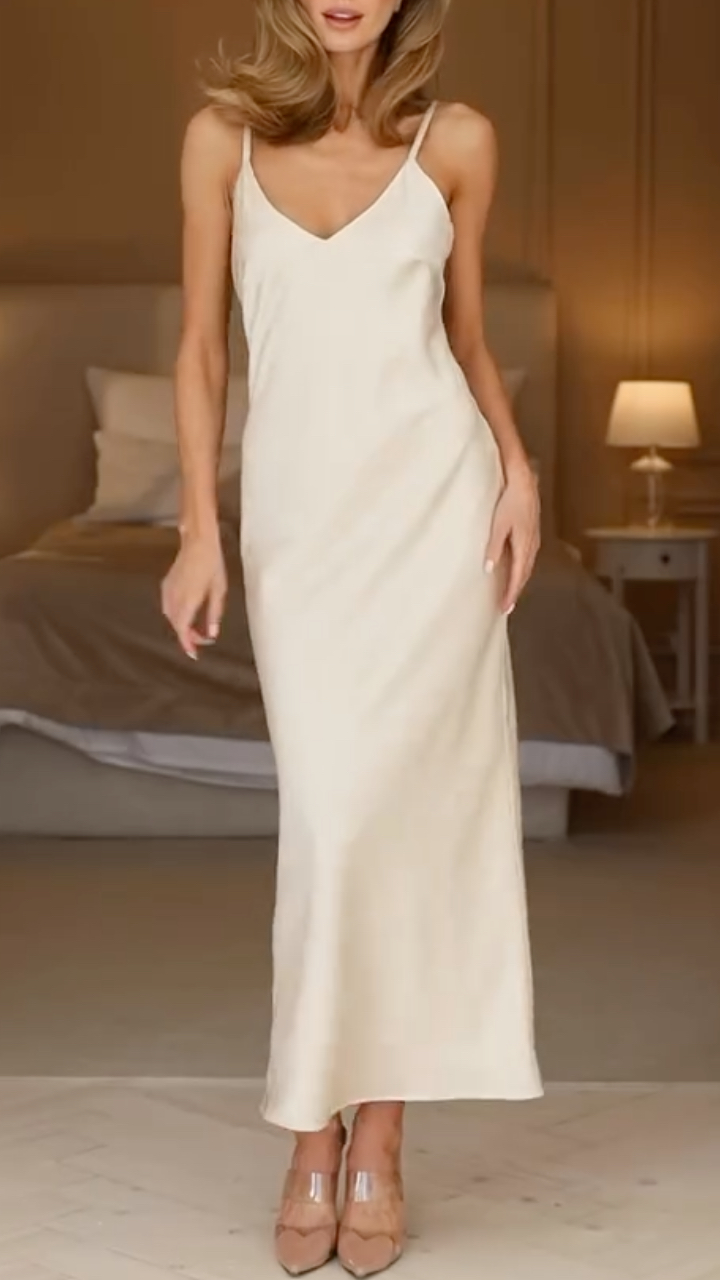 Fit: Slightly loose, flowy fit with a tailored slip dress, offering a comfortable, elegant silhouette that flatters all body types, with no restriction on movement.