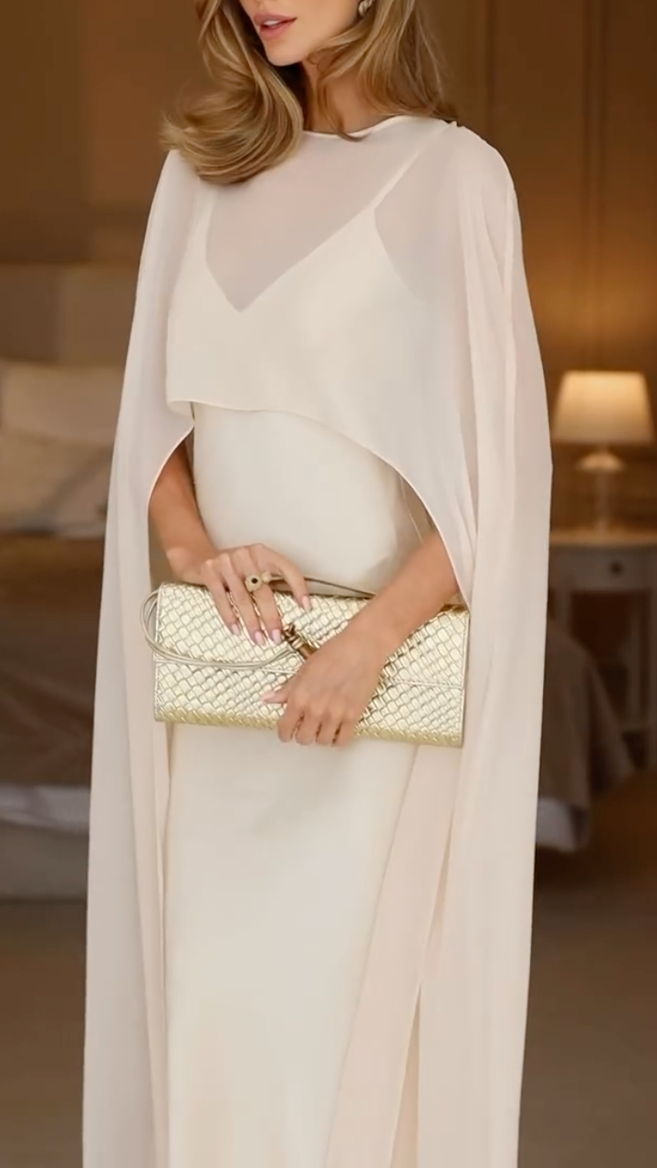 Design: A two-piece set with a sleek satin slip dress as the base, paired with a dramatic cape overlay. The round neckline and cape design add a sophisticated, modest coverage, while the fitted slip dress hugs your curves beautifully. The floor-length cut with a flared hem creates a timeless, glamorous look.
