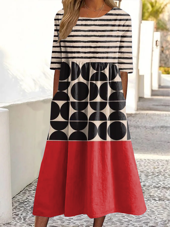 Vintage Abstract Art Print Round Neck Pocket Midi Dress