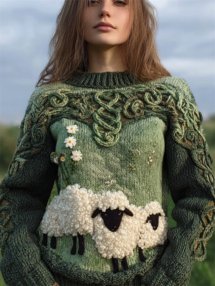 Vintage Fuzzy Sheep Floral Celtic Cozy Knit Sweater