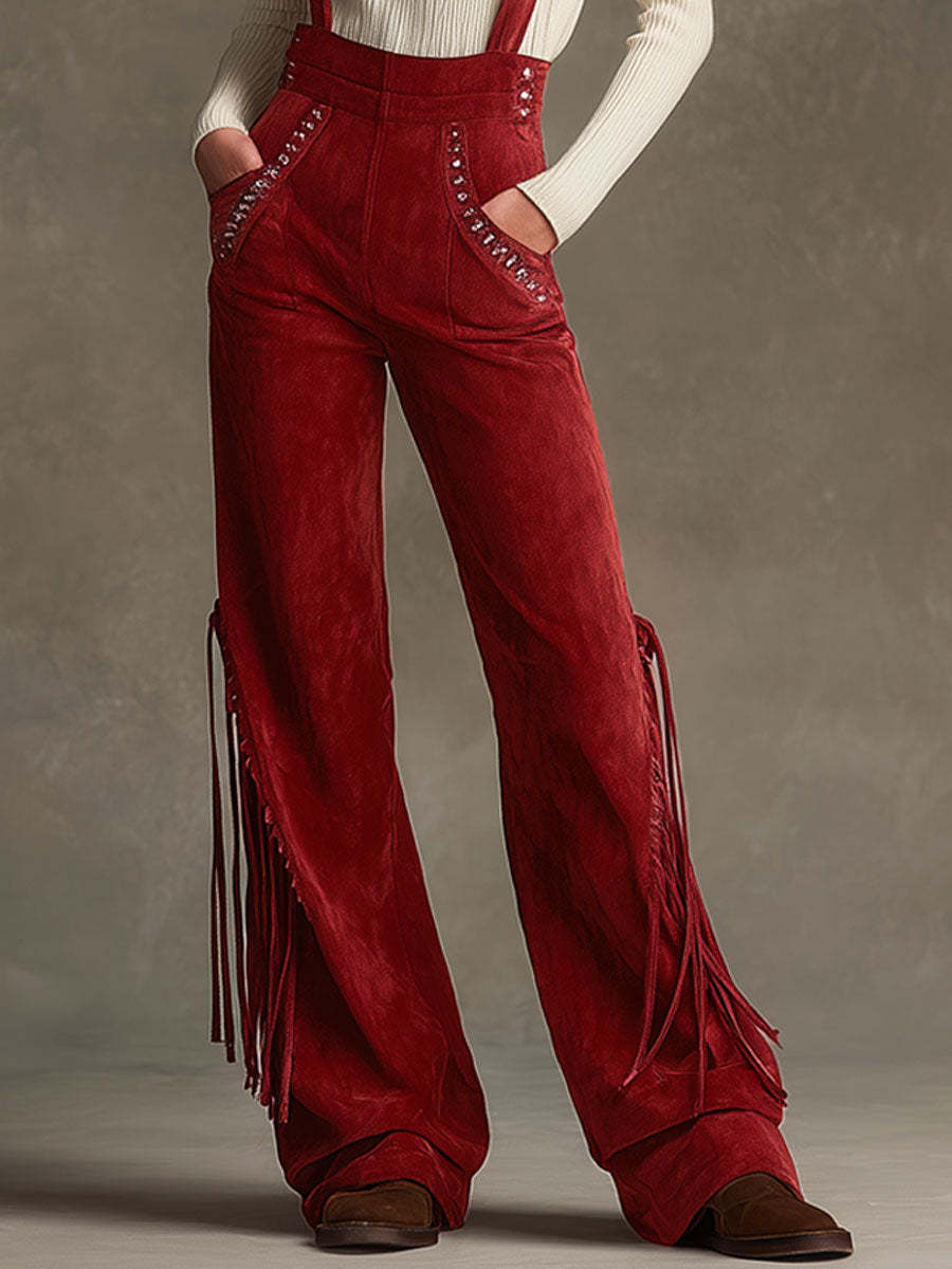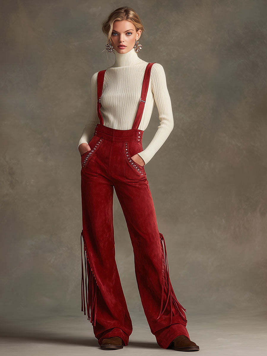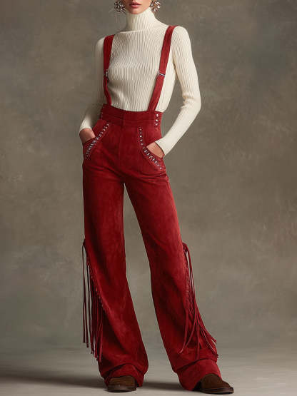 The design features classic overall straps and a flattering fit, enhanced by eye-catching studded details that add a touch of edge. Tassels along the sides and hem bring a playful, Western-inspired flair, creating movement and texture that elevate the overall look. These overalls can be paired with a simple white tee or a fitted turtleneck for a chic daytime ensemble, or dressed up with ankle boots and statement jewelry for a night out. Ideal for those who appreciate the fusion of retro Western elements with contemporary style, these red faux suede overalls are a unique addition to any fashion-forward wardrobe.