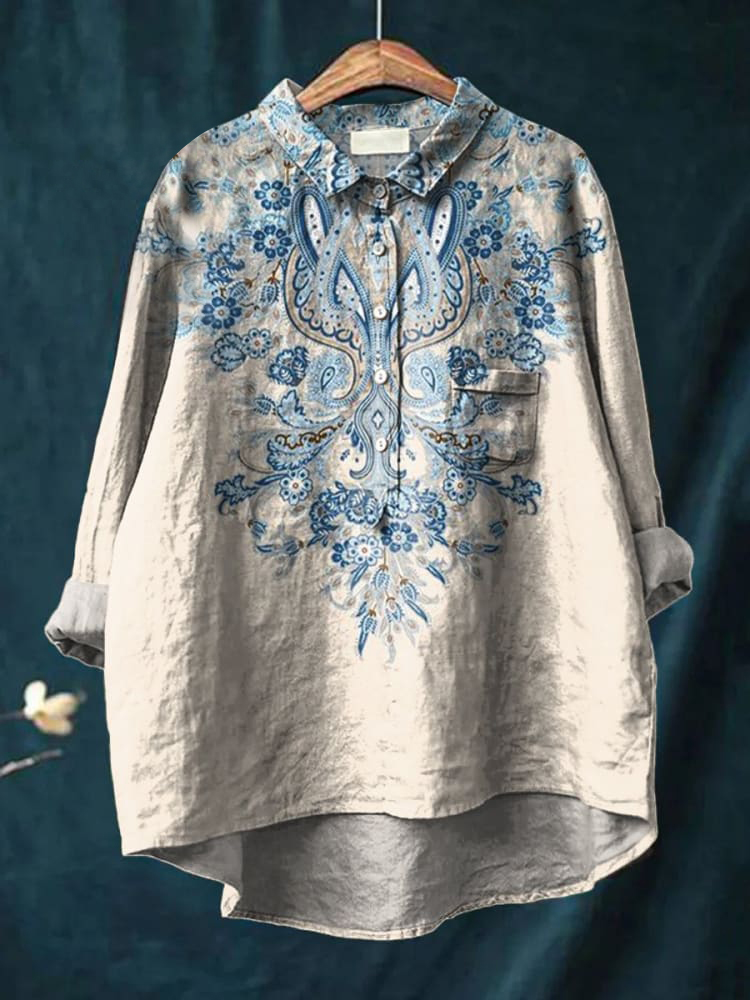 Women's Blue Ethnic Pattern Print Casual Cotton And Linen Shirt