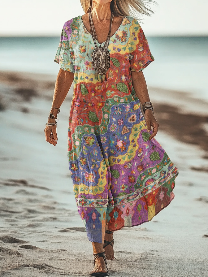 Women's Boho Floral Wave Collage Art Print V Neck Short Sleeve Cotton Pocket Dress