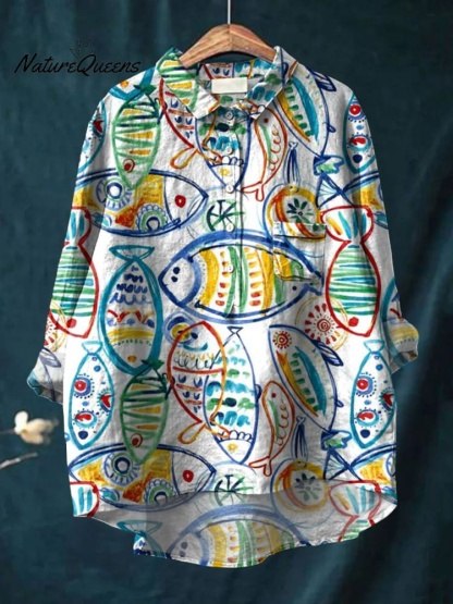 Women's Fish Art Print Casual Cotton And Linen Shirt
