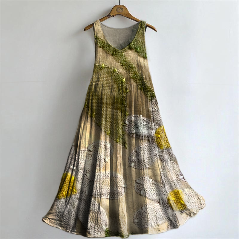 Women's Floral Art Print Round Neck Sleeveless Cotton Pocket Dresses