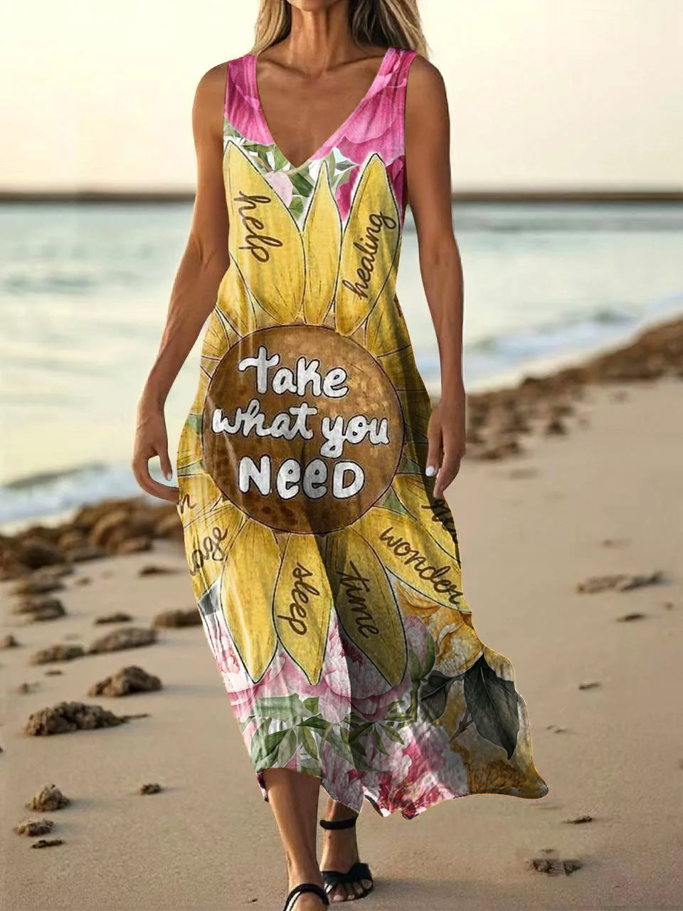 Women's Hippie Floral Art Print Pocket Cotton Dress