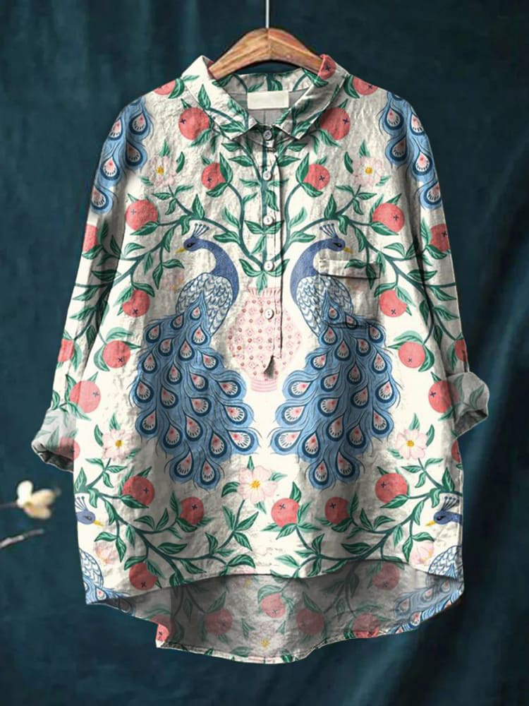 Women's Peacock Fruit Print Casual Cotton And Linen Shirt