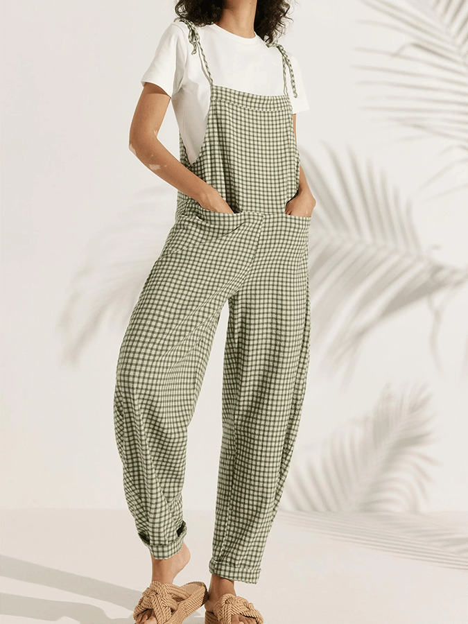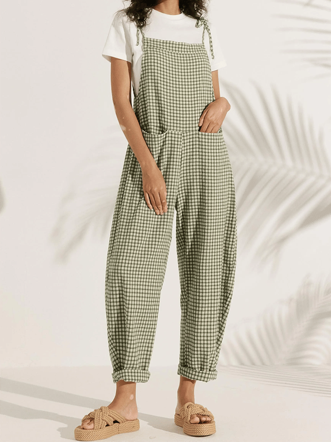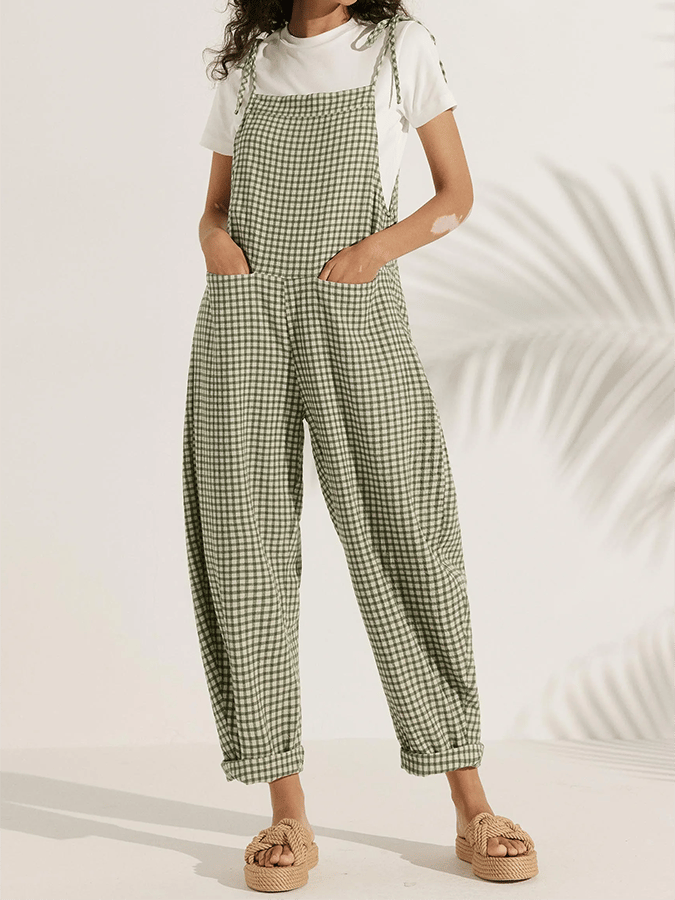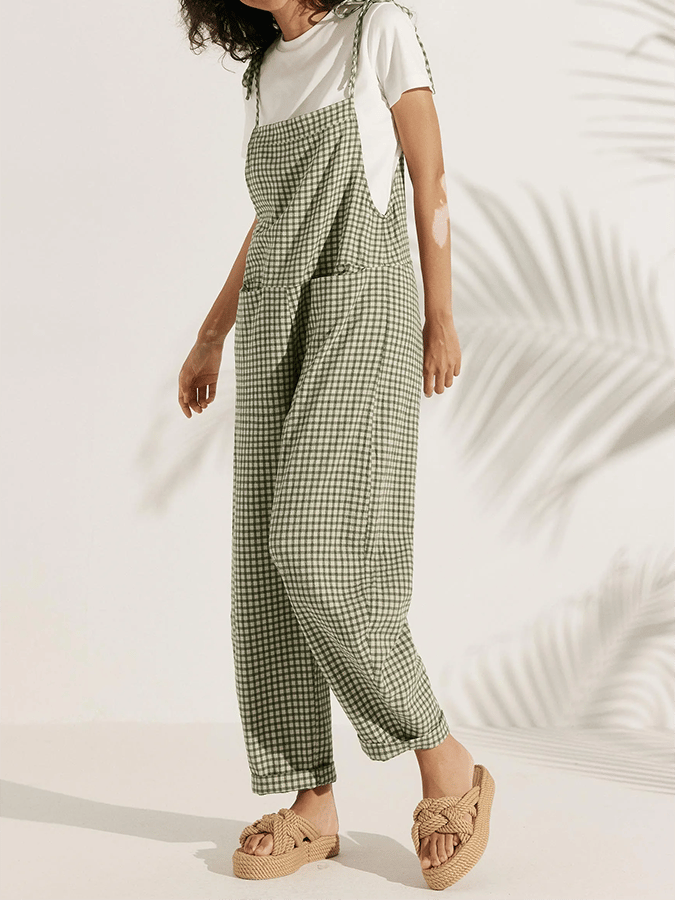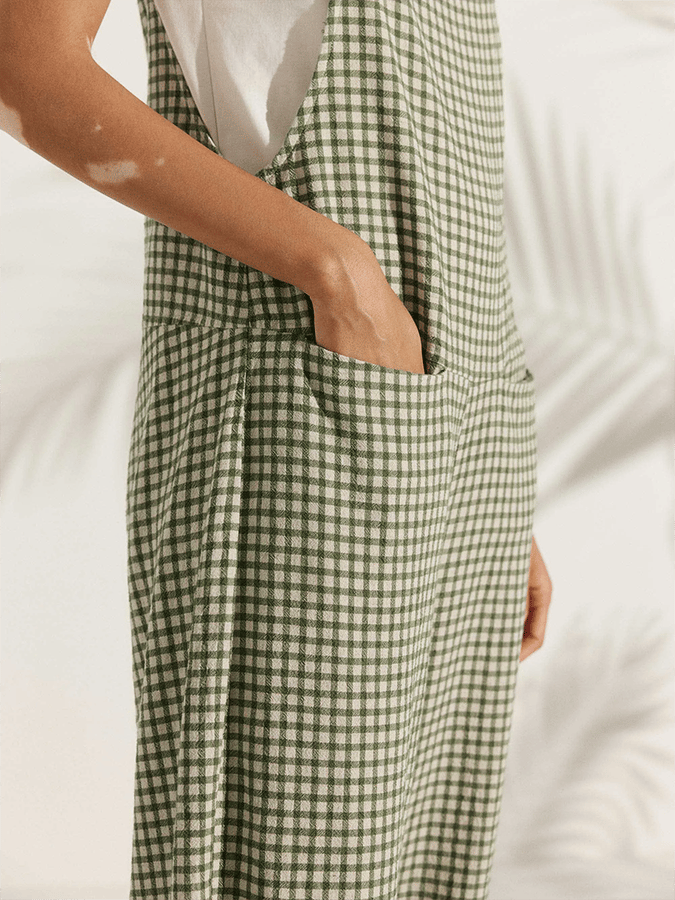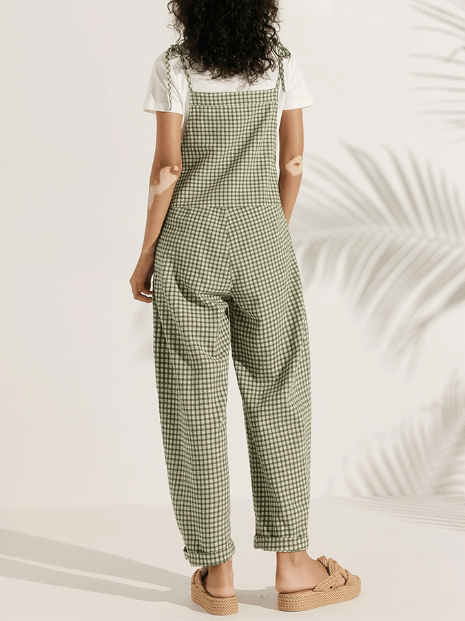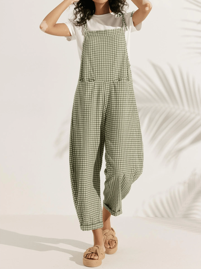 Women's Retro Classic Plaid Square Neck Multi-Pocket Jumpsuit