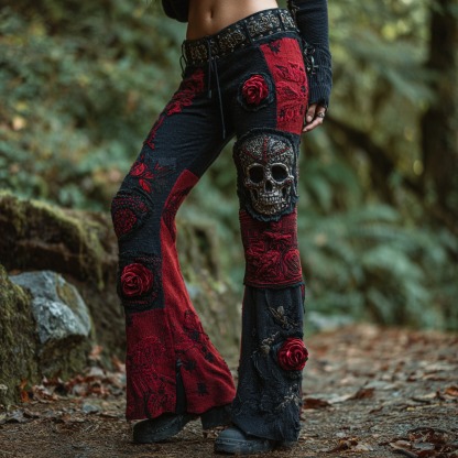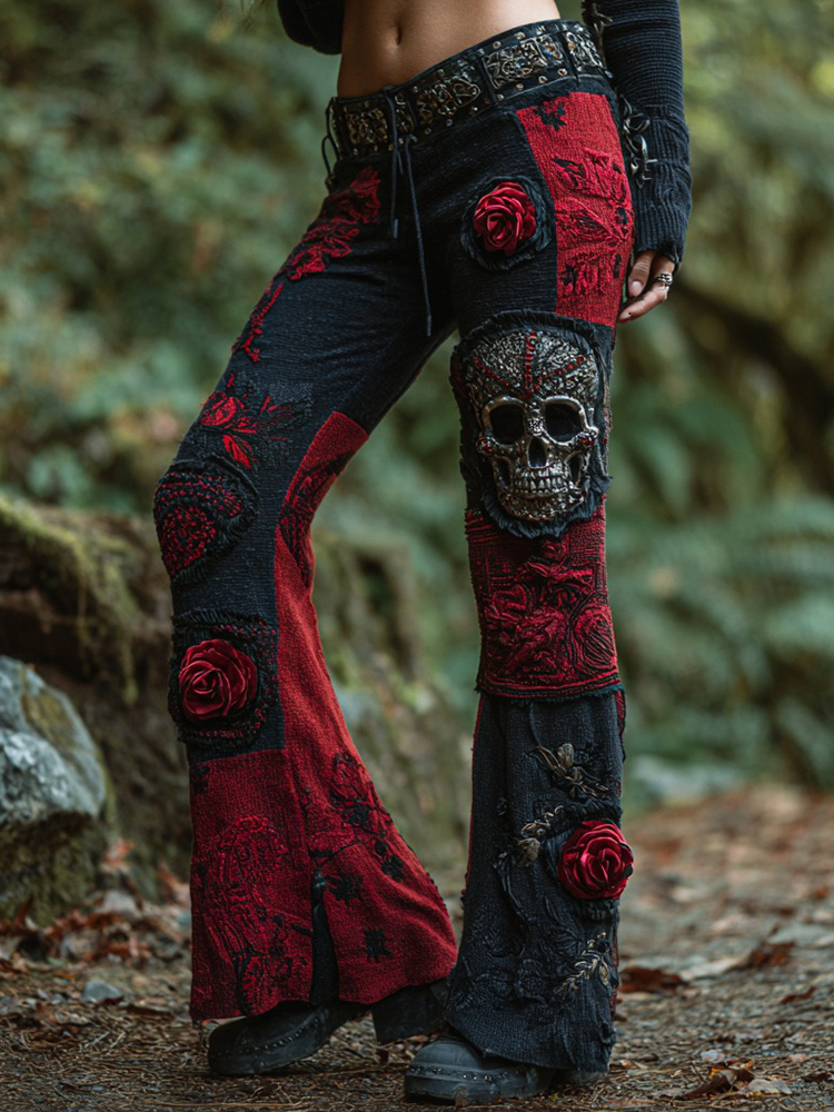Women's Retro Dark Skull And Rose Stitching Casual Jeans