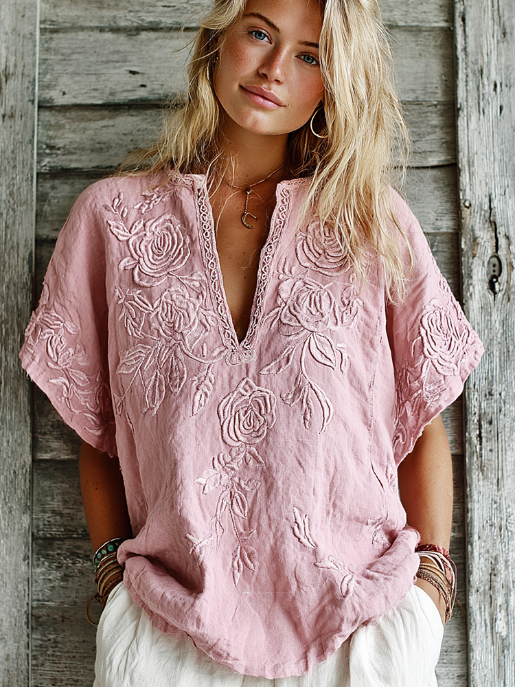 Women's Rose Floral Embroidery Art V Neck Comfy Shirt