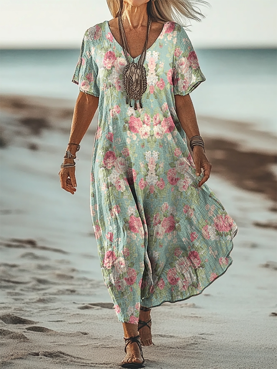 Women's Spring Floral Art Print Flowy Pocket Cotton Dress