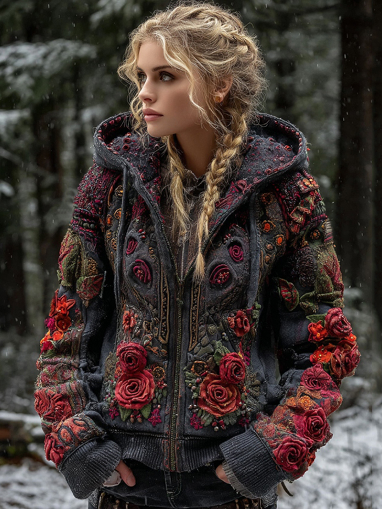 Women's Viking Rose Art Zipper Casual Pocket Hooded