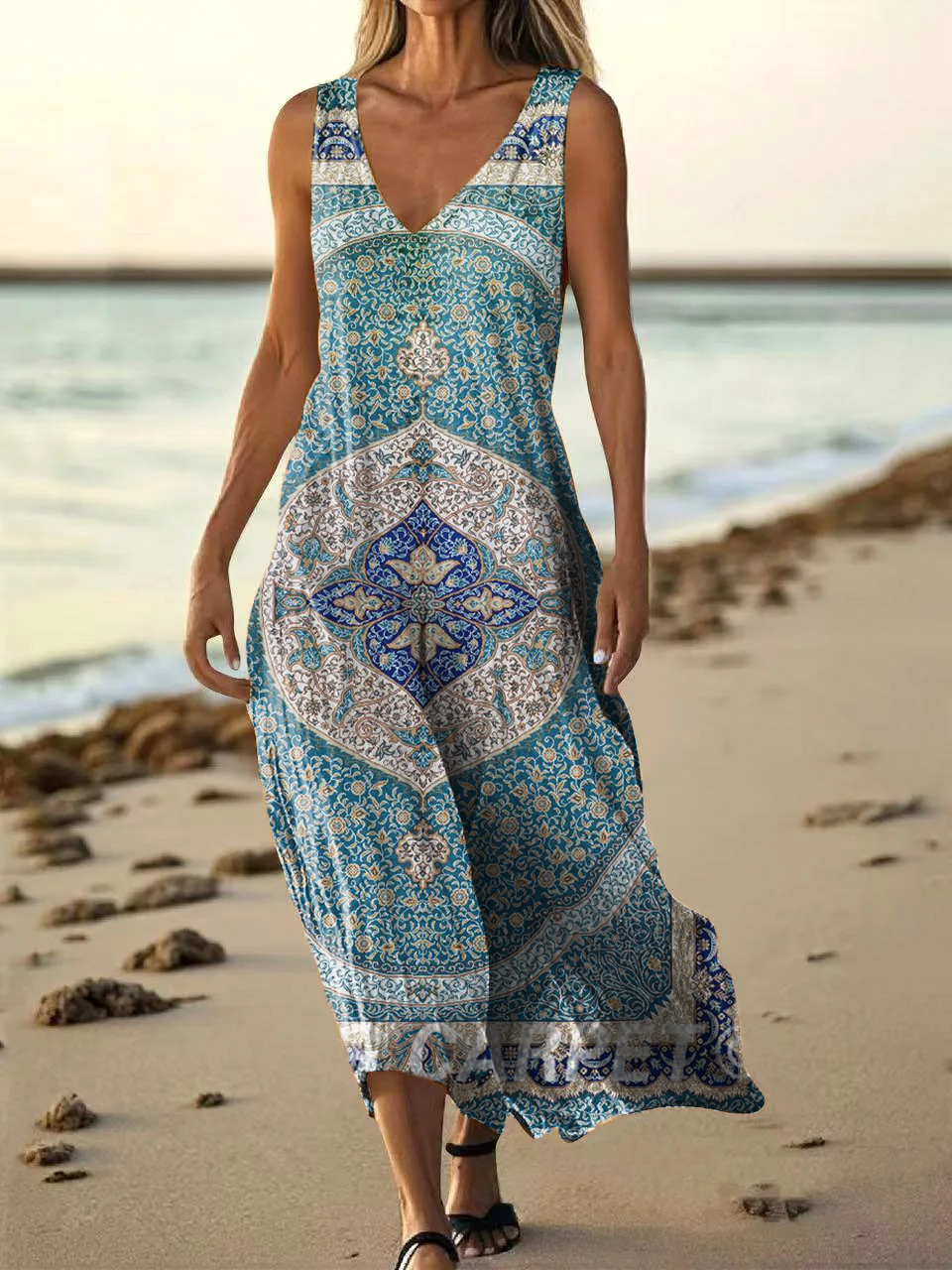 Women's Vintage Ethnic Floral Art Print Pocket Cotton Dress
