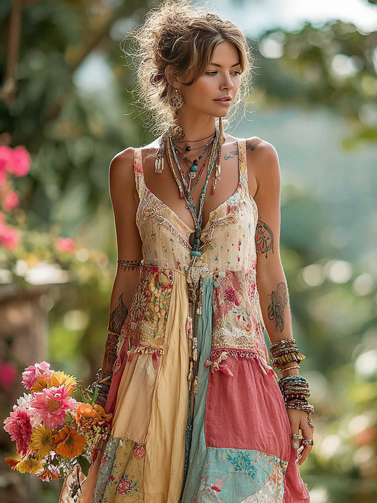 Women's Vintage Floral Applique Sling Maxi Dress