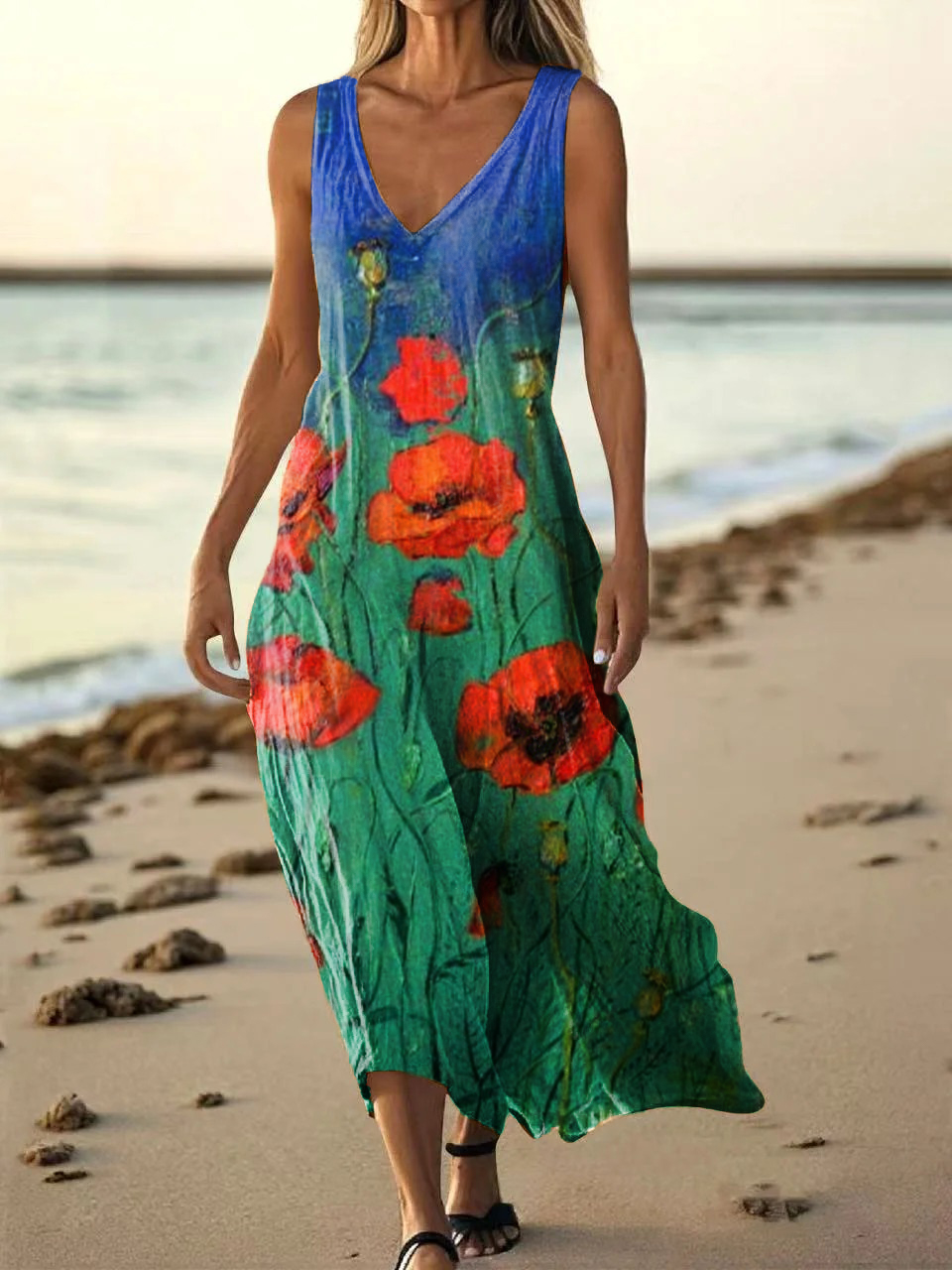 Women's Vintage Floral Art Print Pocket Cotton Dress