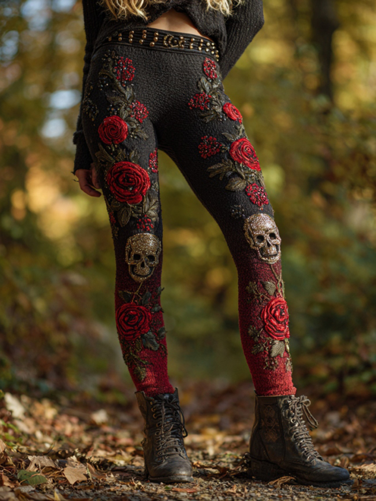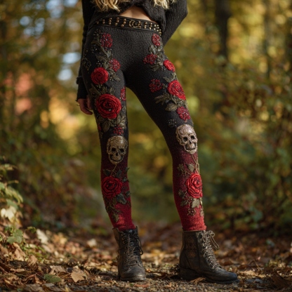 Women's Vintage Skull And Rose Pattern Comfortable Leggings