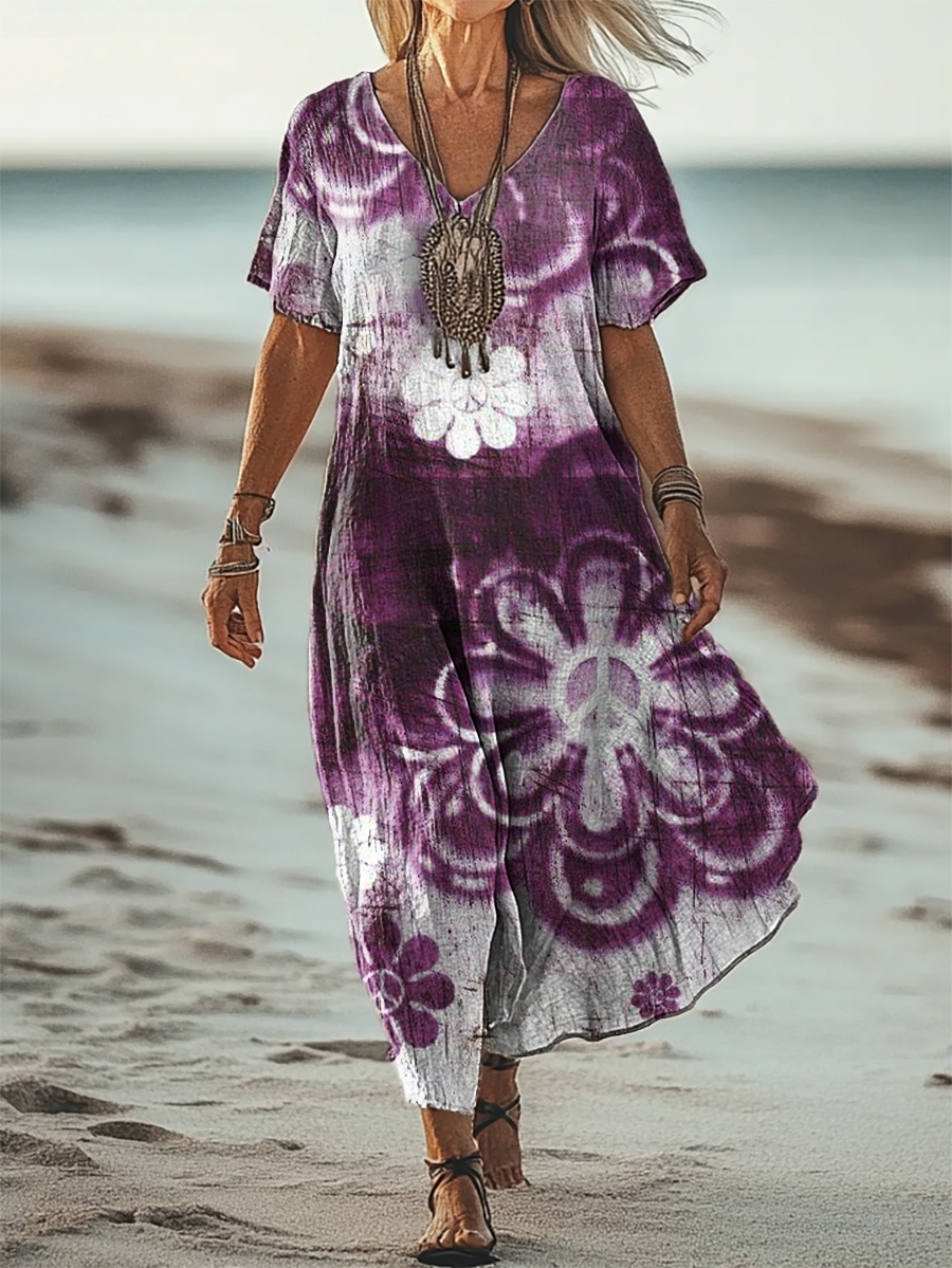 Women's Vintage Tie-Dye Hippie Peace Floral Art Print V Neck Pocket Cotton Dress
