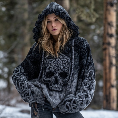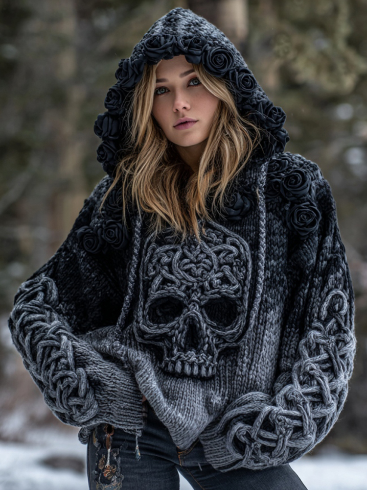 Women's Vintage Viking Tribal Celtic Skull Gradient Art Knit Hooded Sweater
