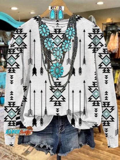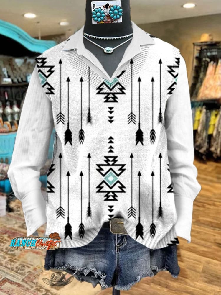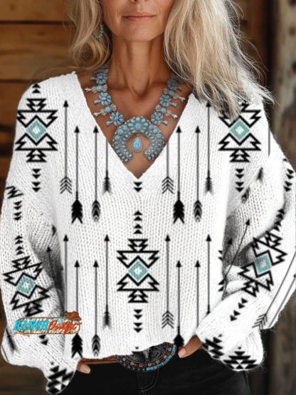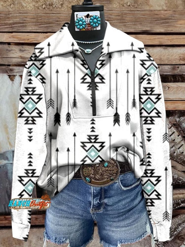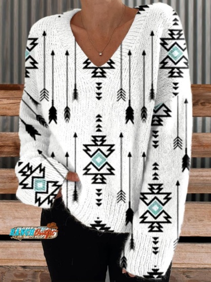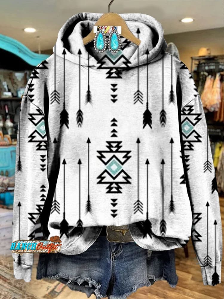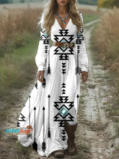 Women's White Vintage Aztec Print Pocket Cotton Dress
