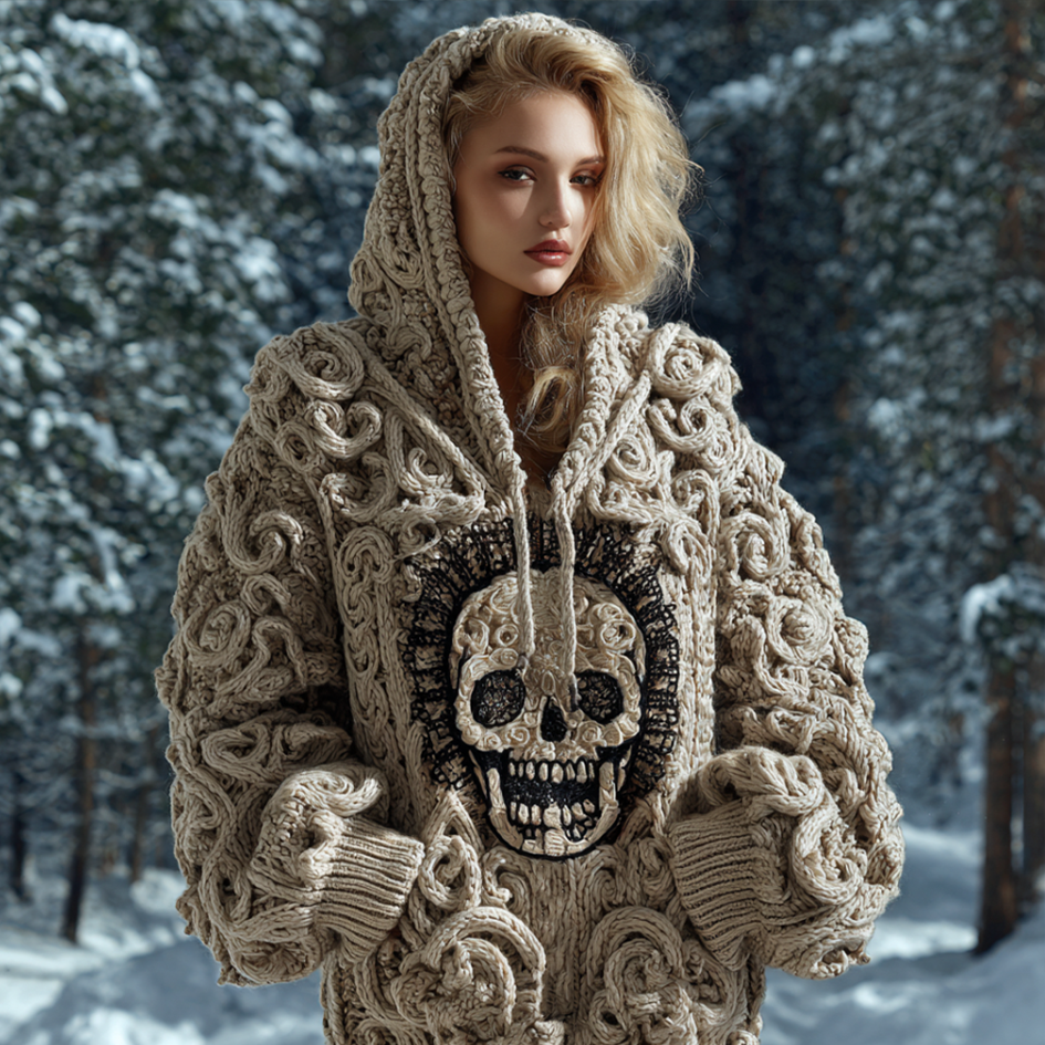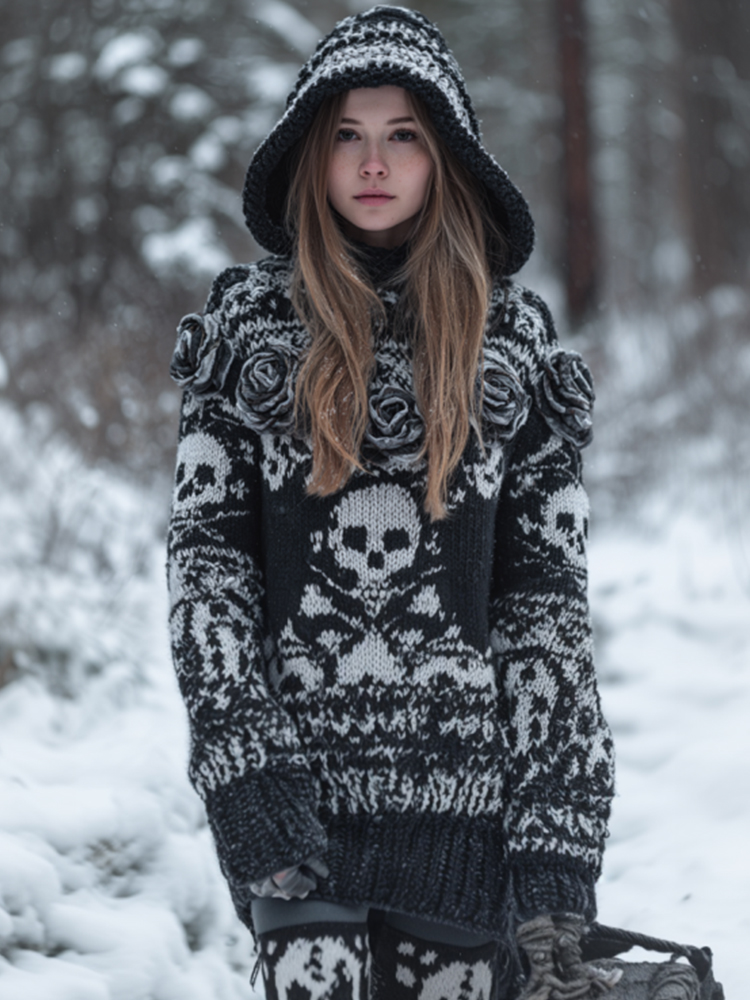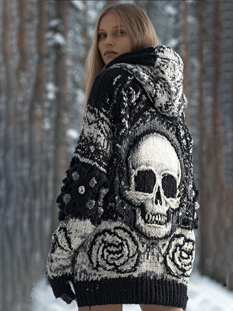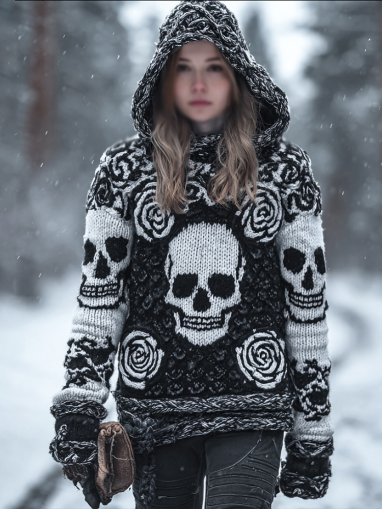 Women's Rose And Skull Inspired Knit Cozy Hooded Sweater