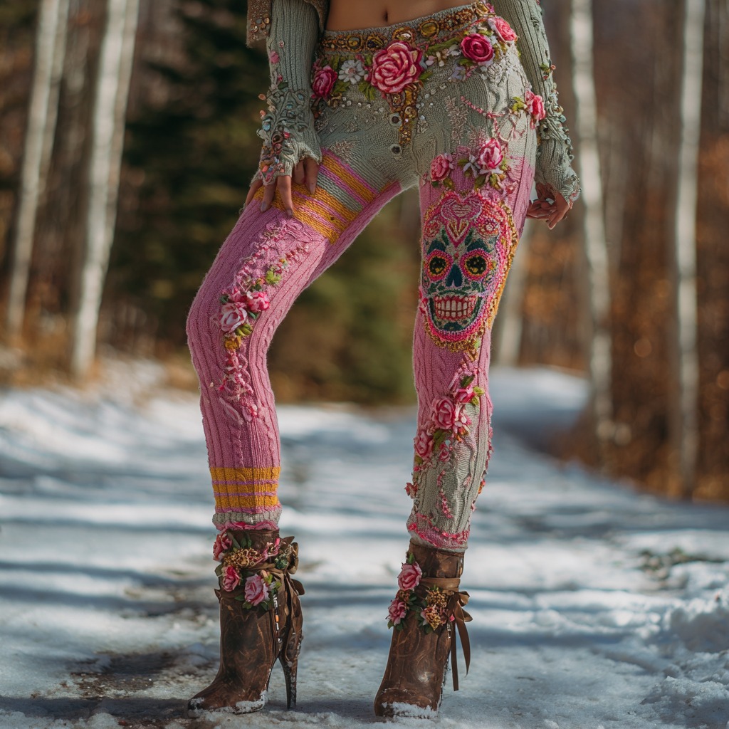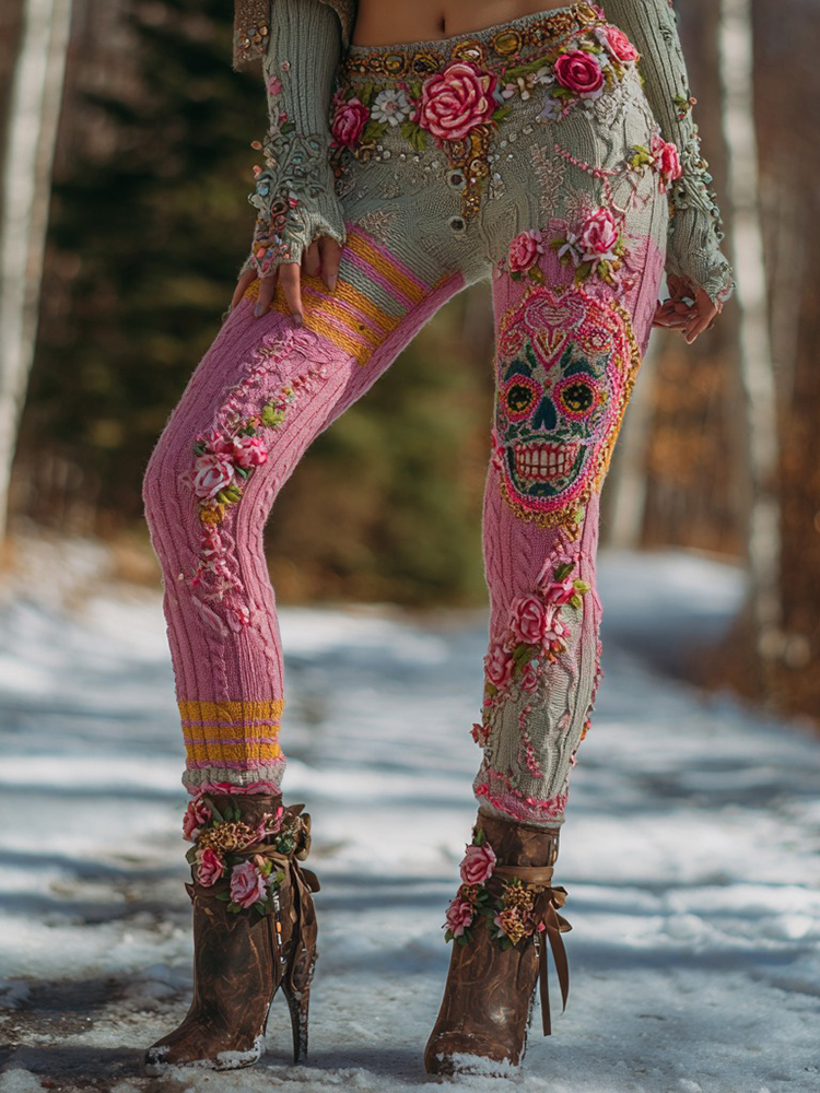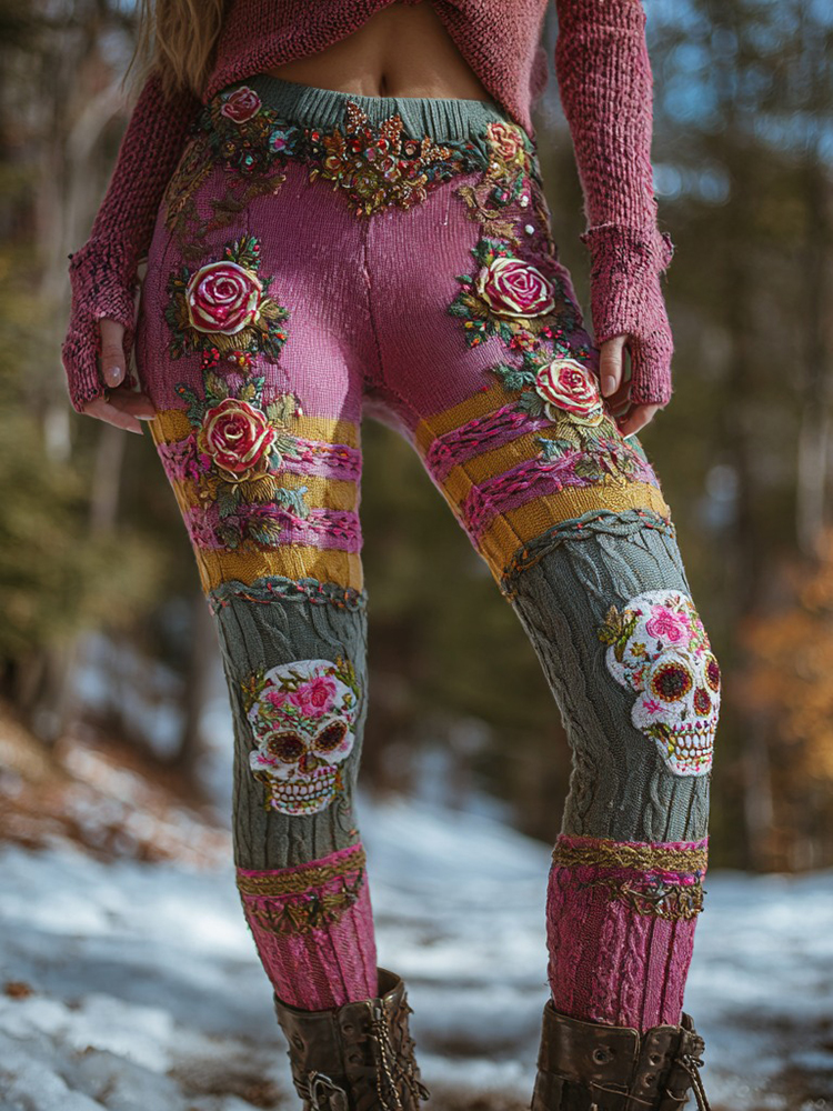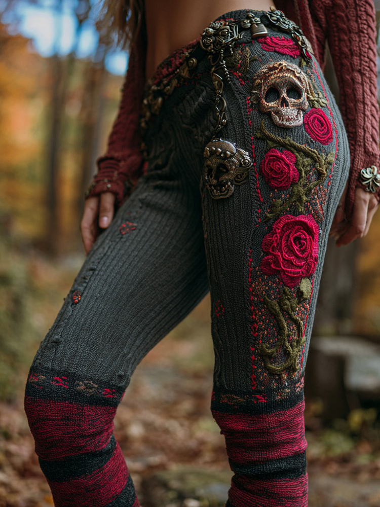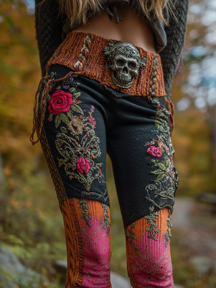 Vintage Skull Embroidered Patchwork Cozy Knit Leggings