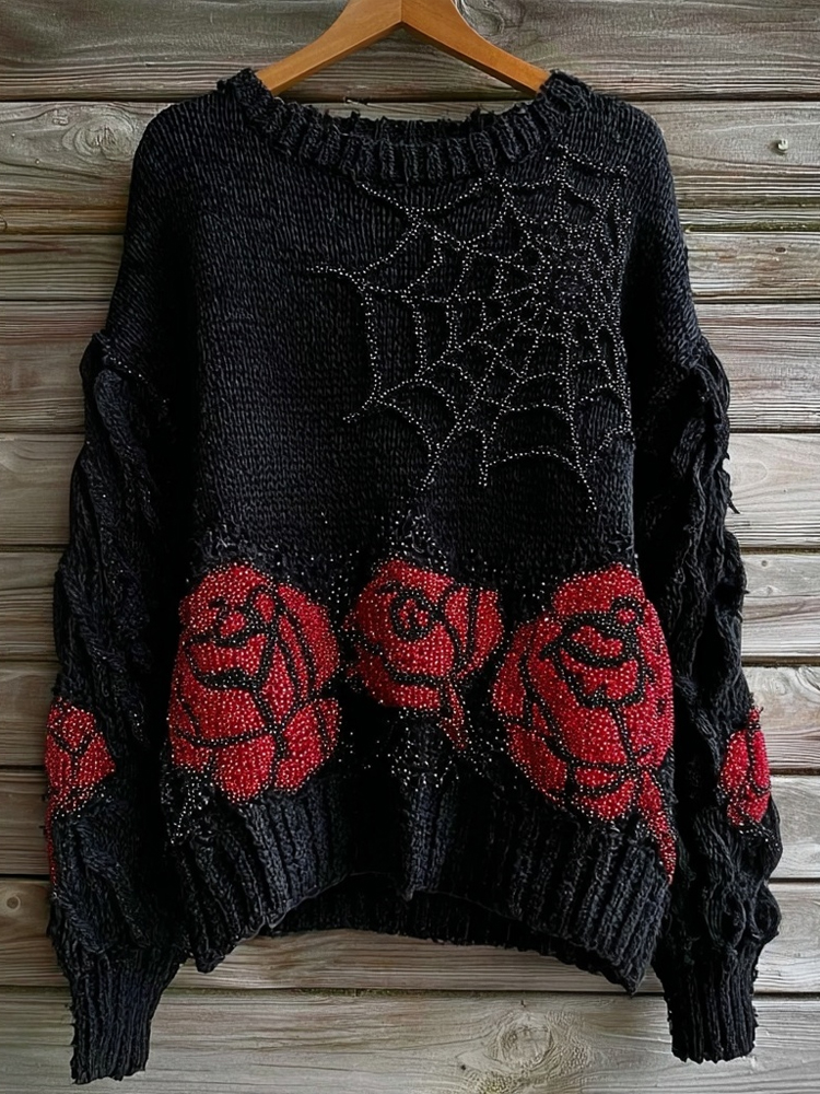 Vintage Roses & Spider Web Glitter Embroidered Cozy Sweater