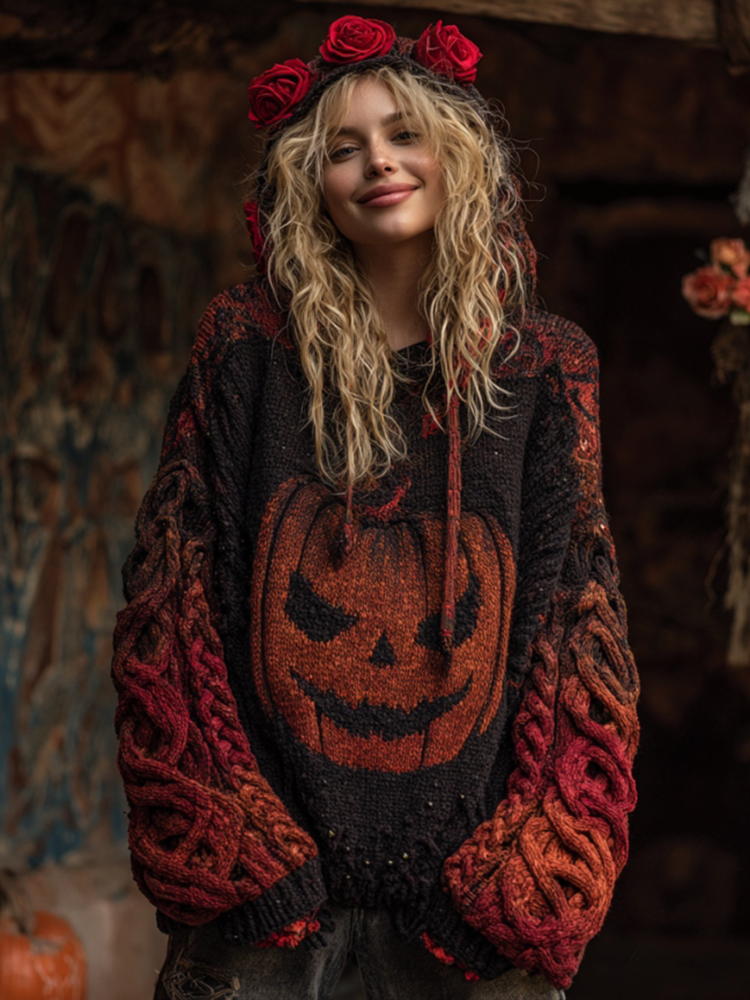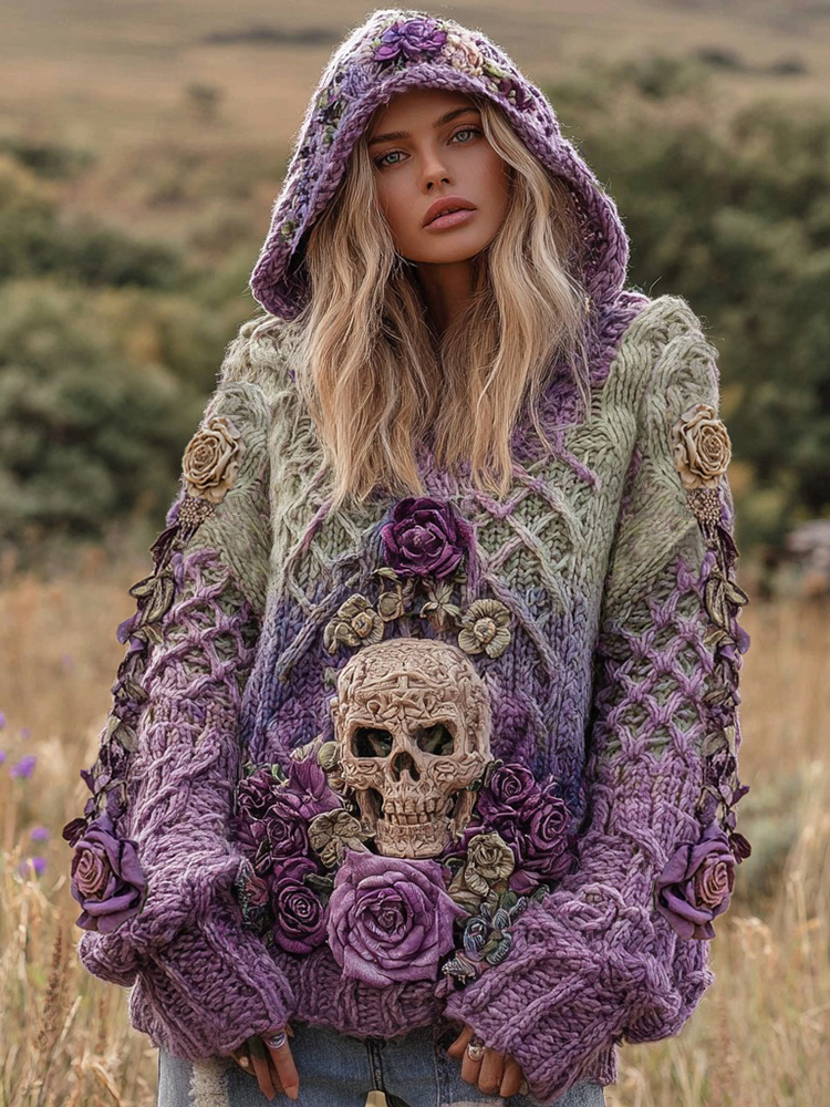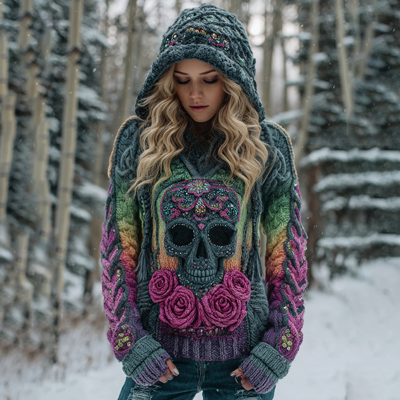 Women's Vintage Skull Flower Gradient Art Cozy Knitted Hooded Sweater