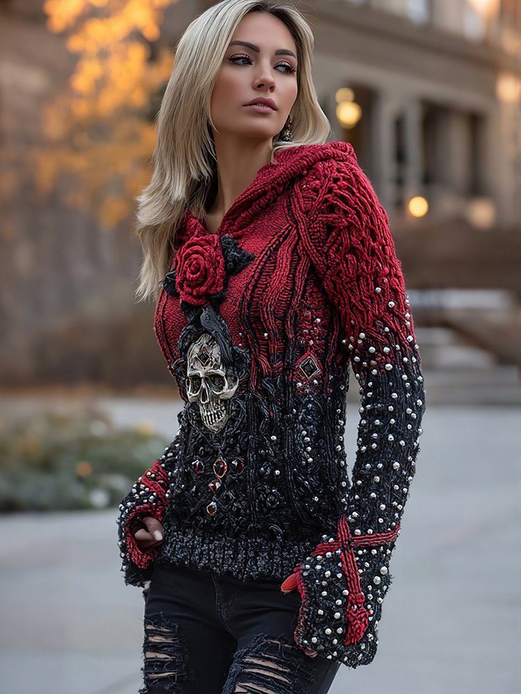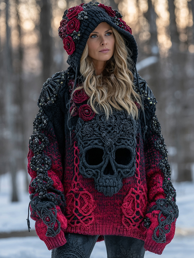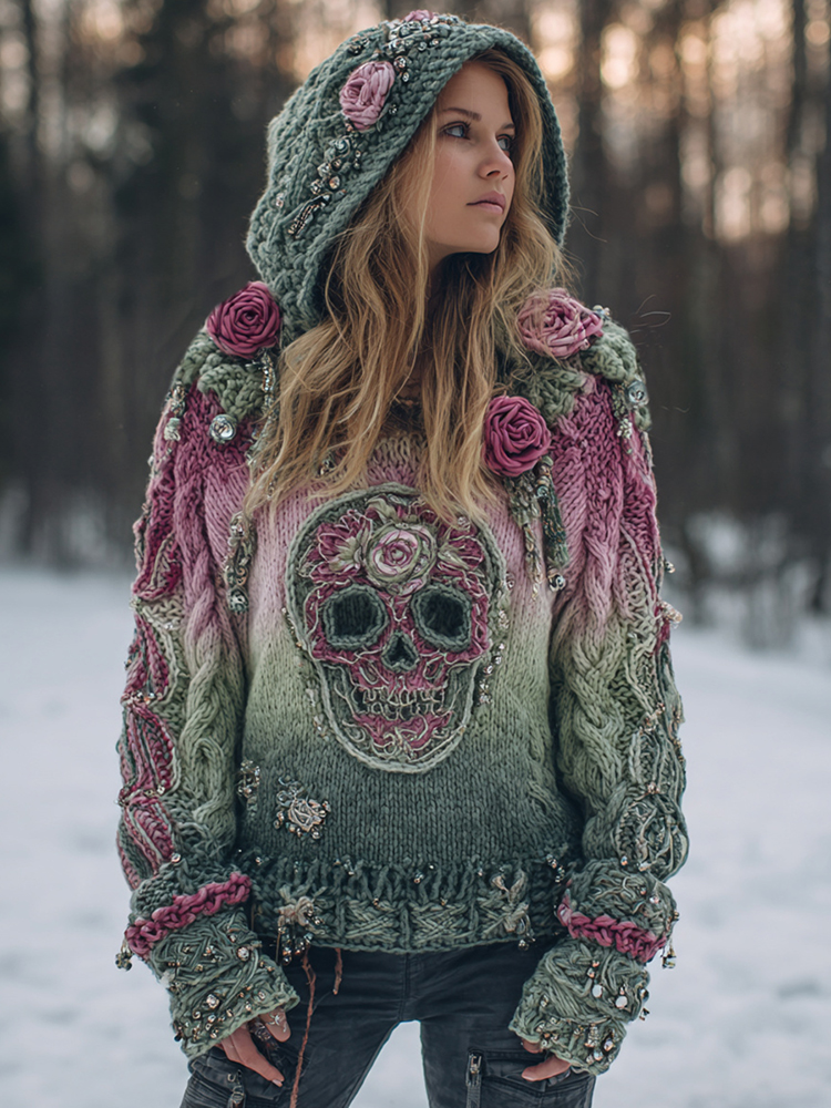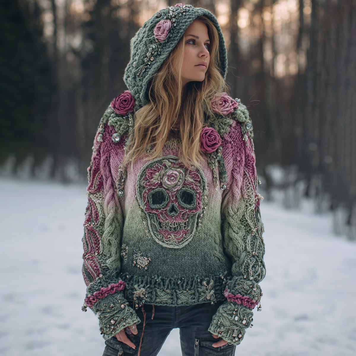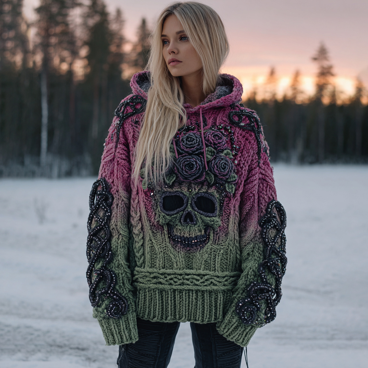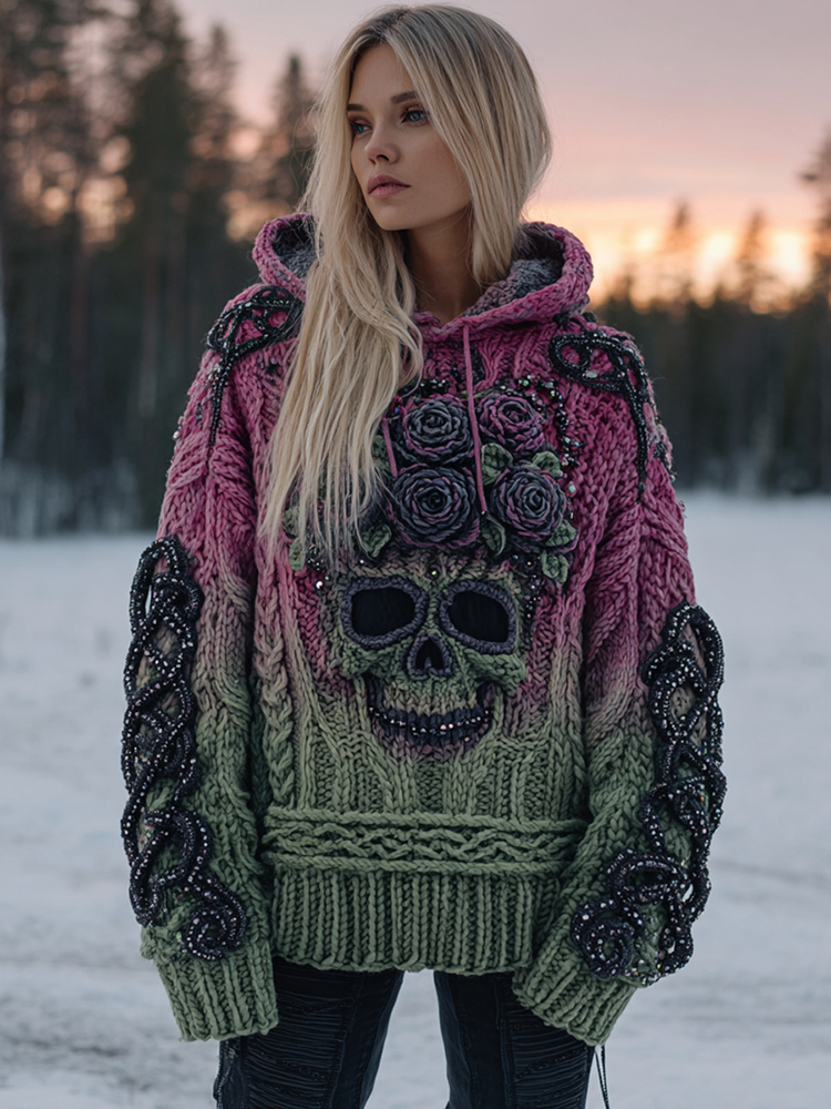 Women's Gradient Rose And Skull Inspired Chunky Knit Hooded Sweater