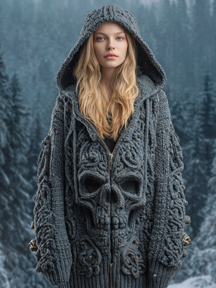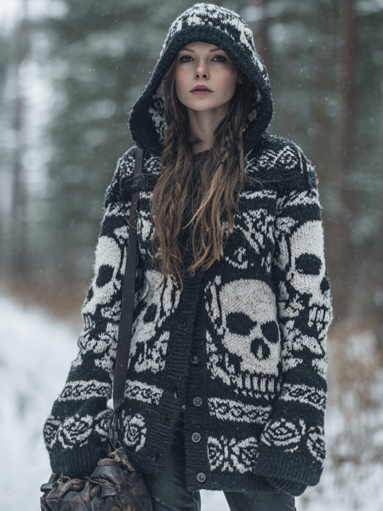 Women's Viking Tribal Jacquard Celtic With Rose And Skull Inspired Chunky Knit Hooded Sweater